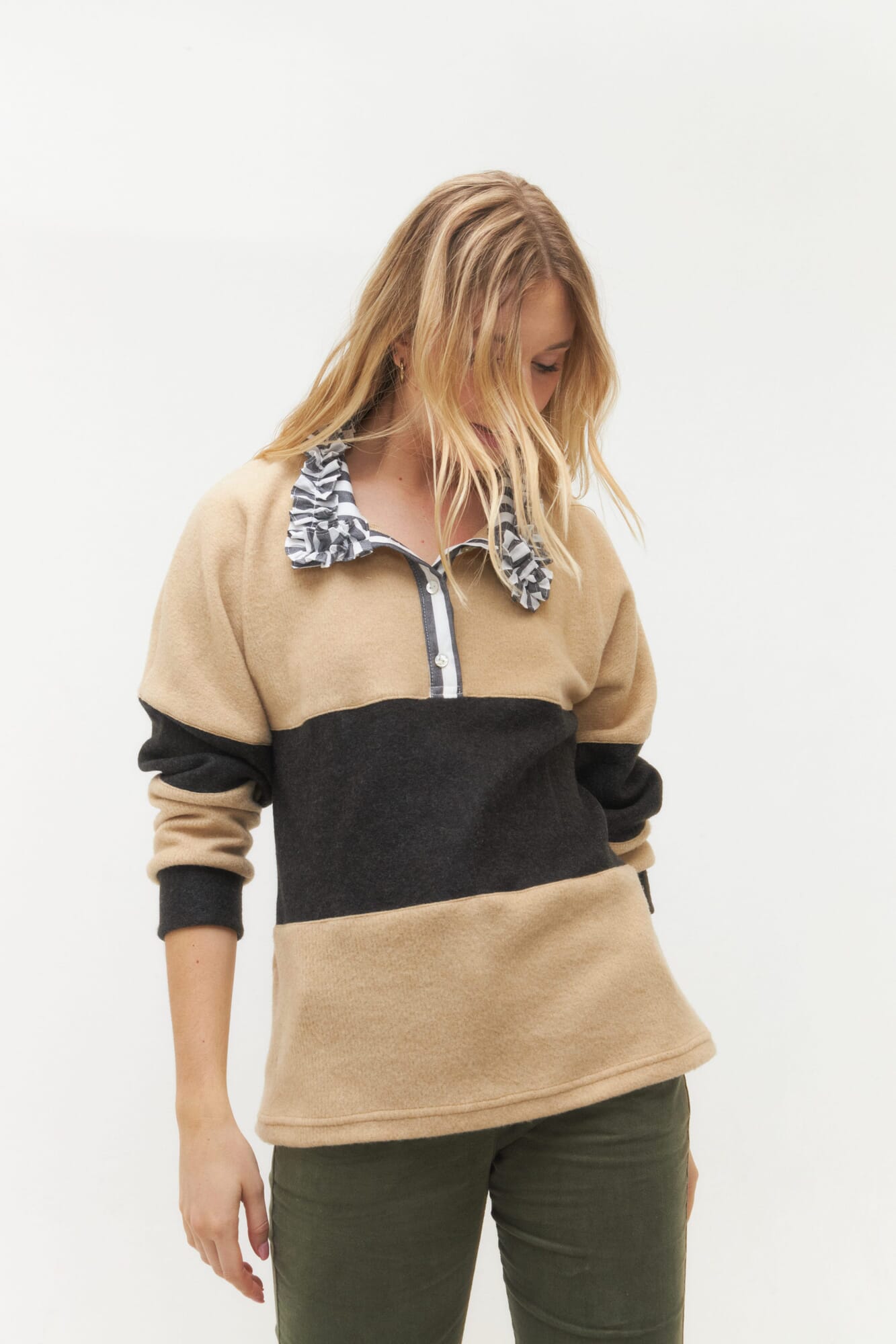 Este buzo es una prenda de abrigo de diseño casual y elegante, con un estilo que combina la comodidad de un suéter con la sofisticación de un cuello camisero. Se caracteriza por su cuello amplio tipo camisa, que le da un toque más formal y estructurado, al mismo tiempo que es práctico y cómodo.