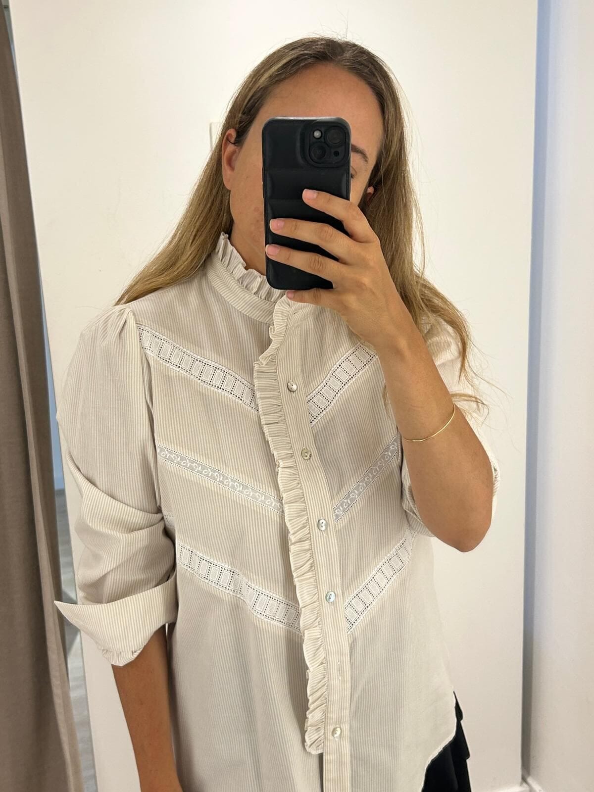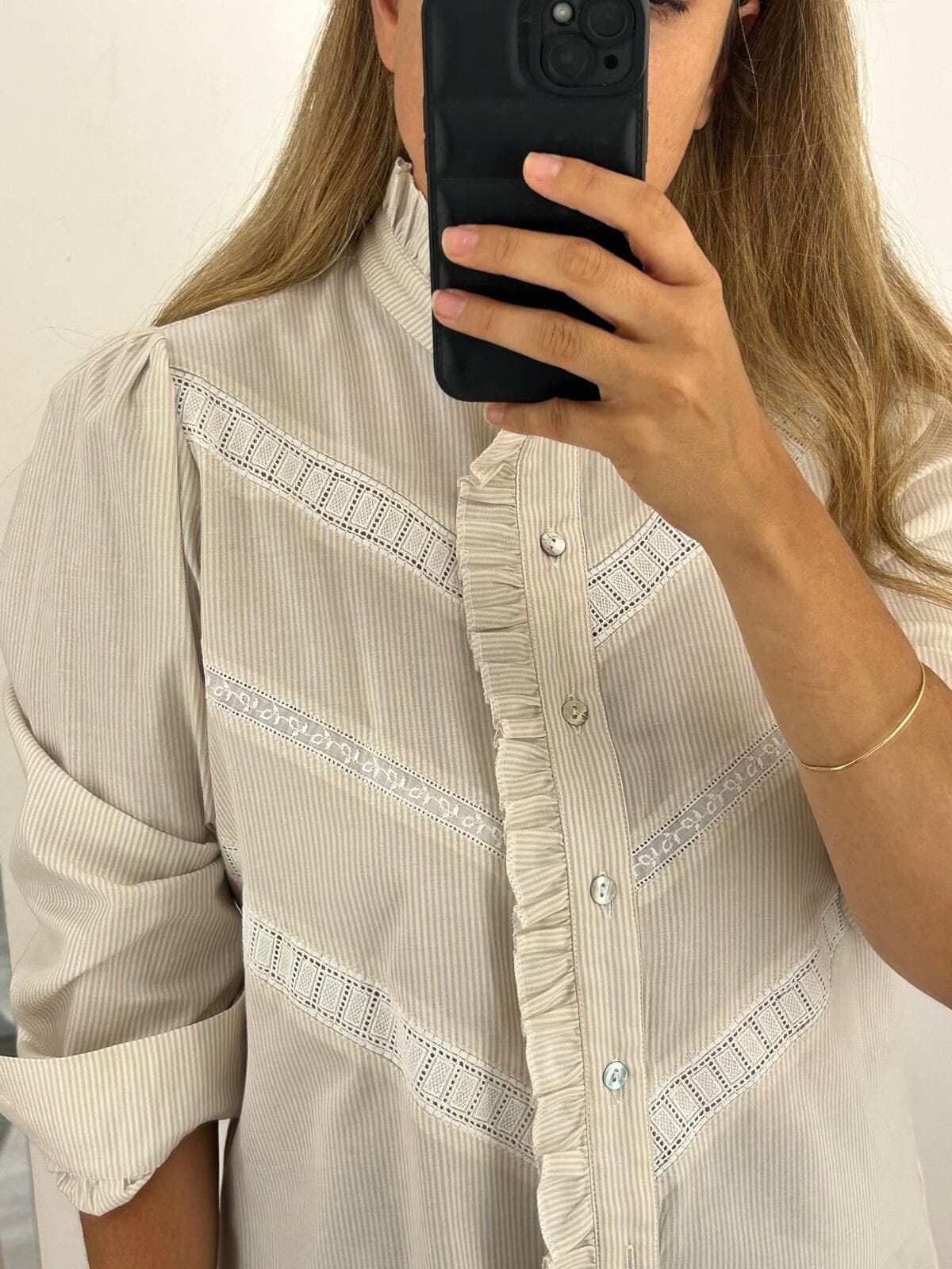 Esta camisa de manga larga es la elecci贸n perfecta para un look chic y moderno. Con detalles de festones y volados, su dise帽o aporta un toque delicado y sofisticado. Se abotona de forma central, permitiendo un ajuste c贸modo y estilizado, y puedes llevar las mangas remangadas para un aire m谩s relajado. Ideal para combinar con jeans o una falda, esta camisa se adapta a cualquier ocasi贸n. 隆Un must-have en tu guardarropa!