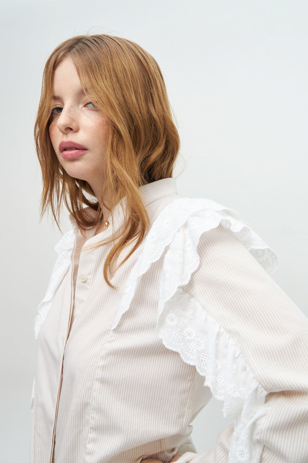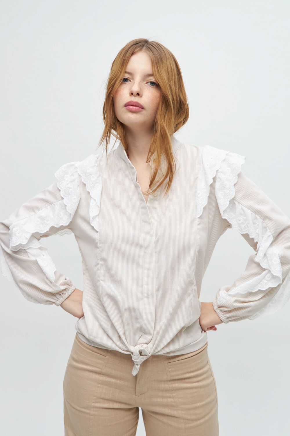 La camisa Maui destaca por sus volados en la sisa y mangas, añadiendo un toque distintivo y elegante. Su único botón dorado le da un acabado sofisticado. Es una pieza versátil ideal para combinar con jeans, pantalones de vestir o faldas. Perfecta tanto como para la oficina o eventos.