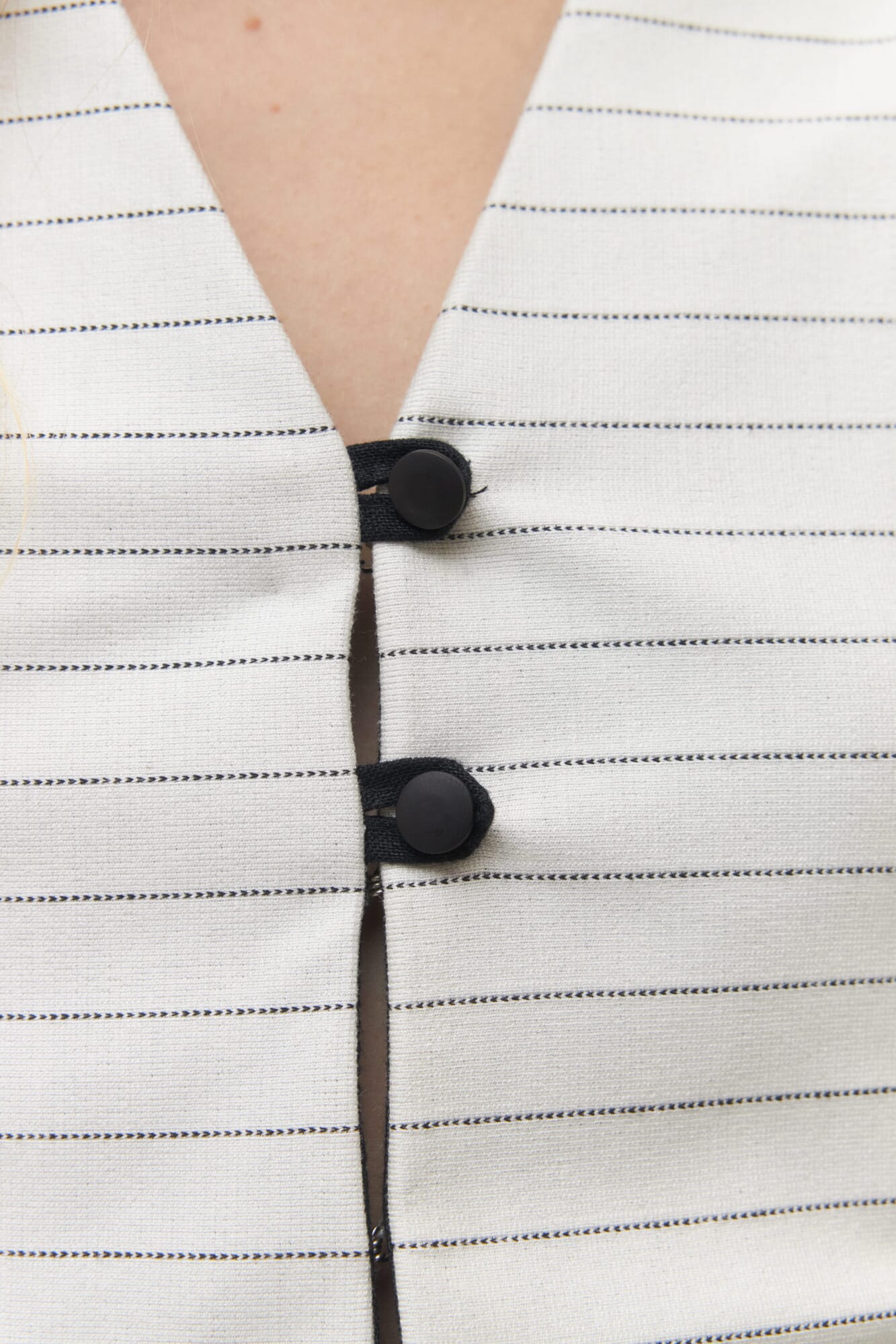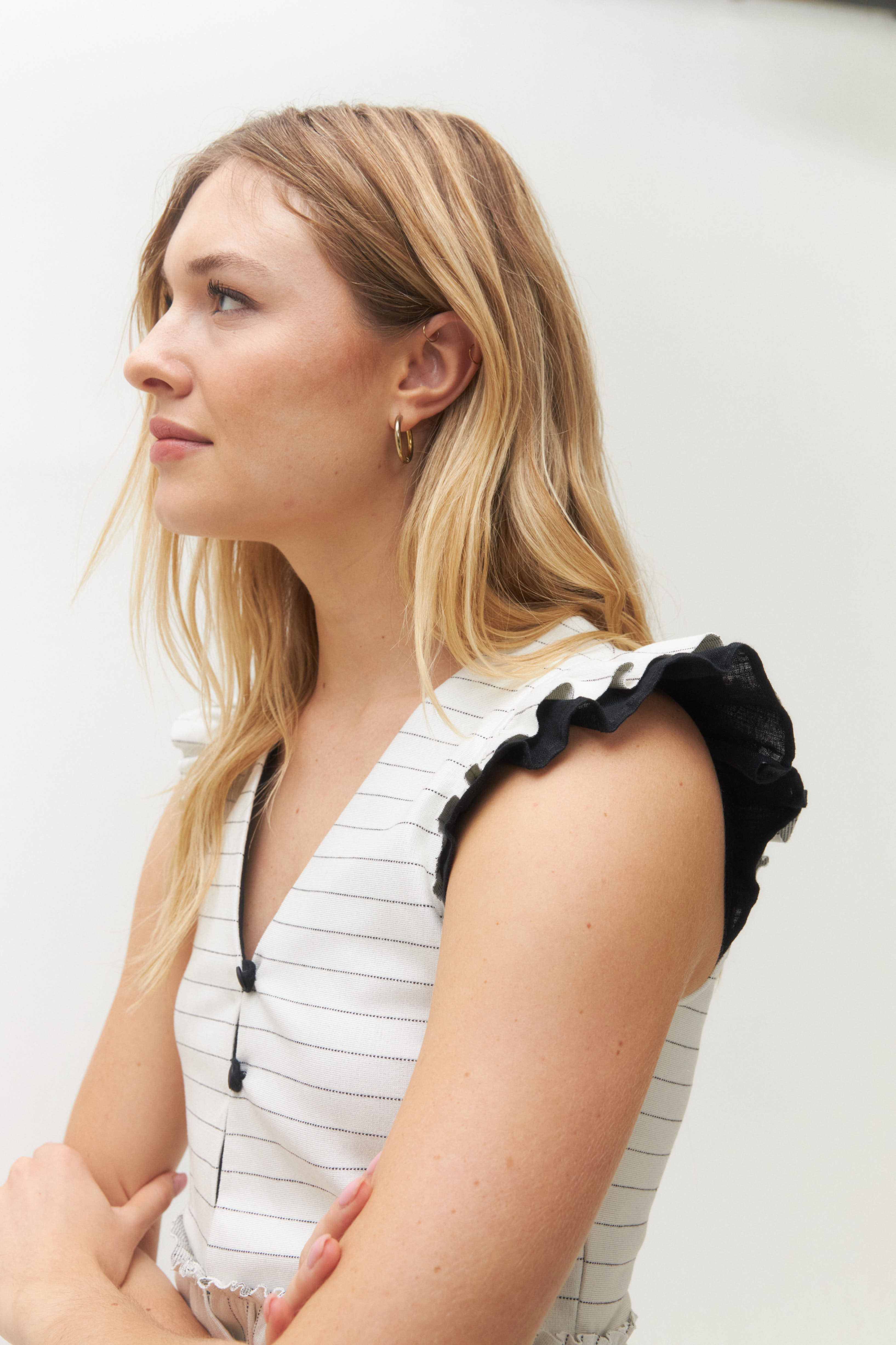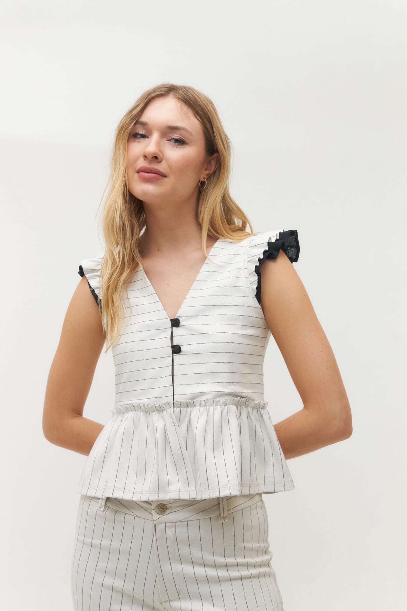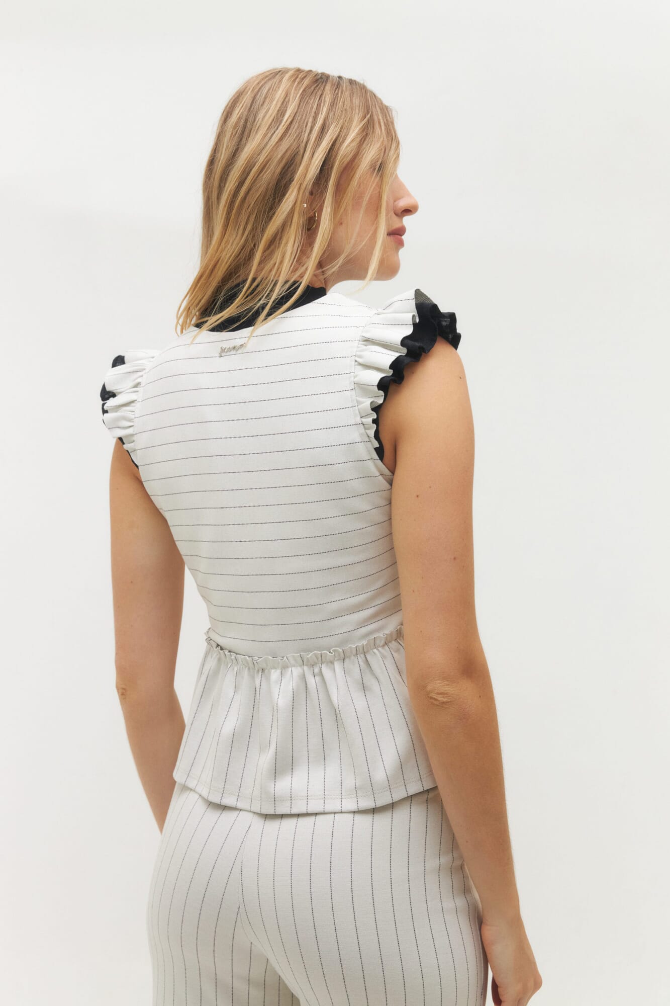 Un chaleco sastrero que redefine la elegancia femenina. El volado de lino en los hombros, le aporta un toque de frescura y distinci贸n. La parte inferior, con otro volado en la misma tela del cuerpo, le da movimiento y suavidad, creando una silueta sofisticada.