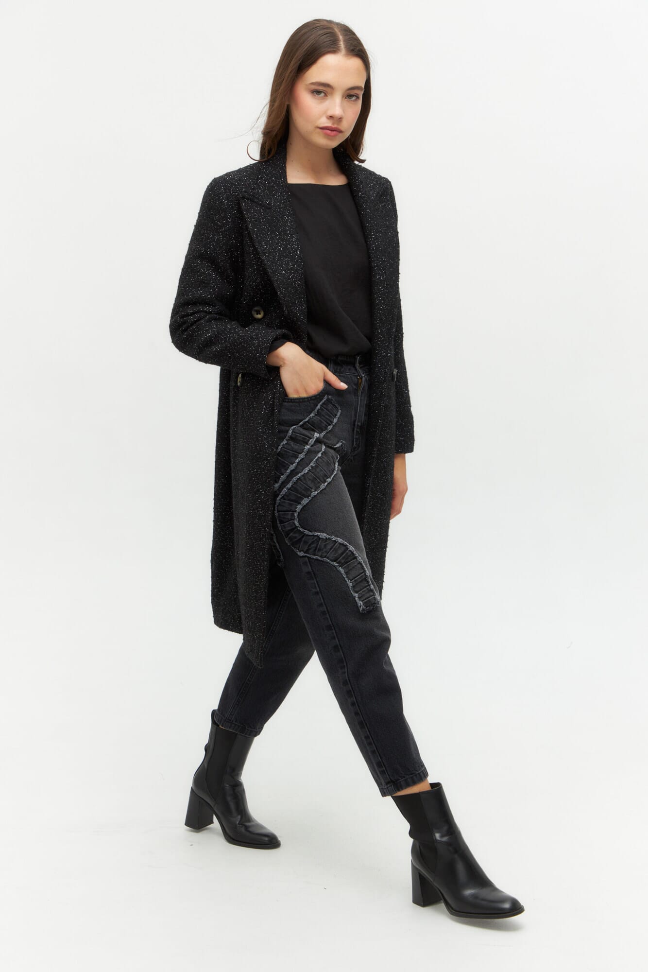 Este jean estilo mom fit en tono gris lavado combina comodidad con un diseño original y atrevido. Su detalle distintivo es el aplique fruncido en forma de espiral en la pierna izquierda, confeccionado en el mismo denim con ribete en contraste, que aporta textura y un toque artesanal muy Margo. Tiro alto, con bolsillos delanteros y traseros funcionales, y cierre frontal con botón y cremallera. Ideal para quienes buscan una prenda versátil pero con personalidad.