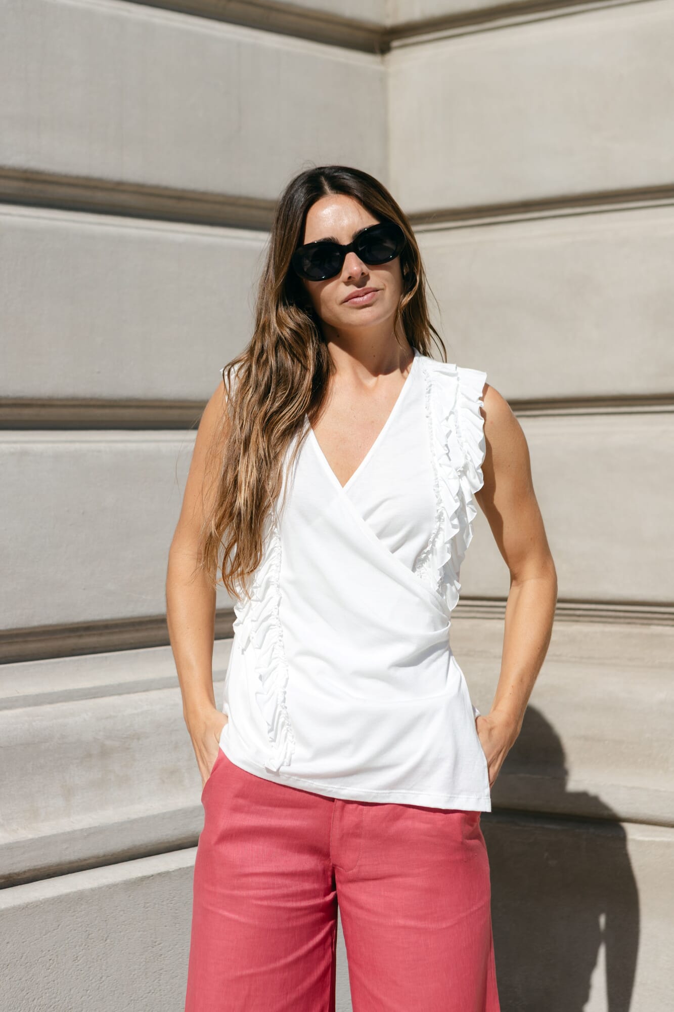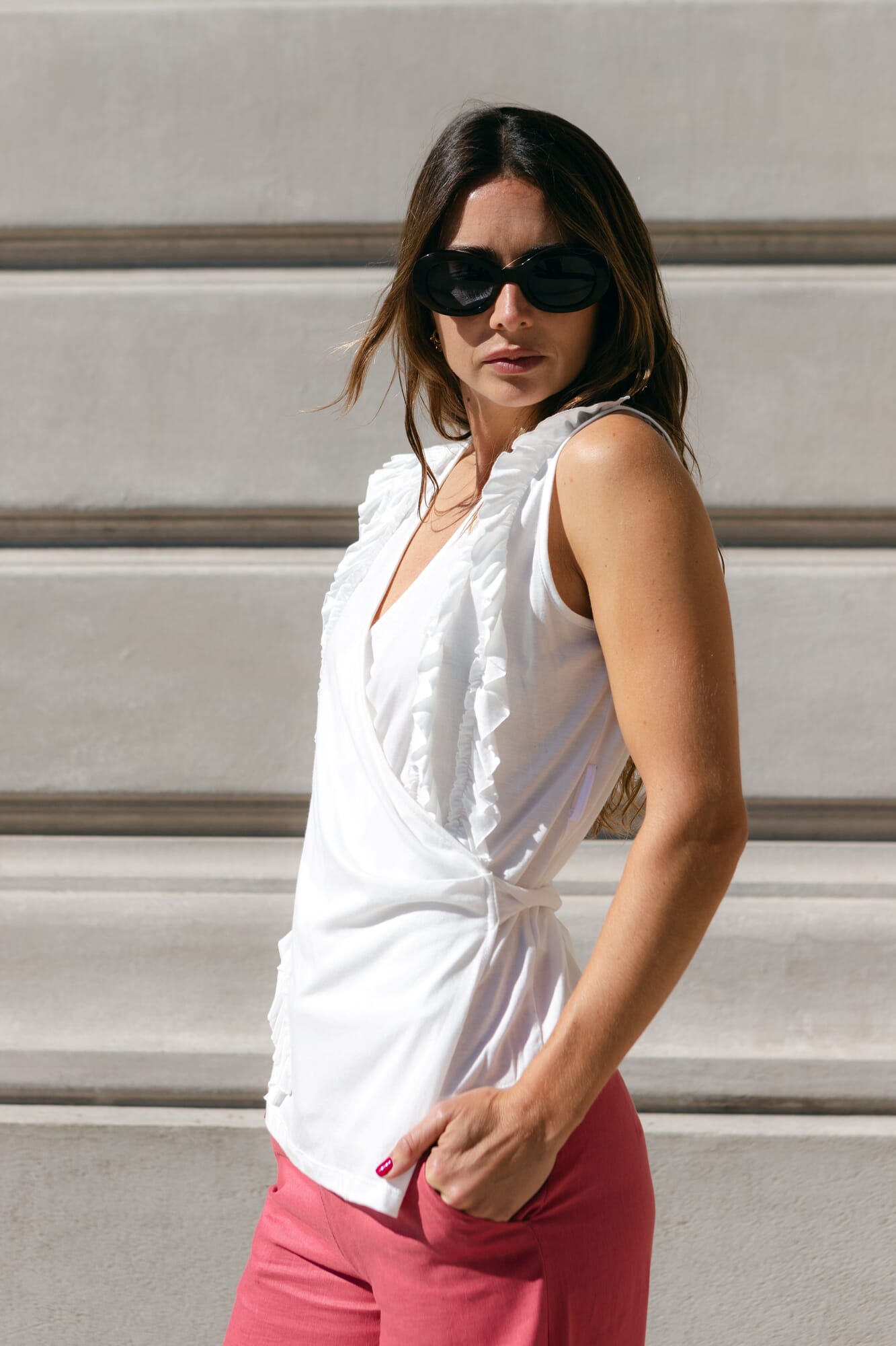 Musculosa cruzada con escote en V que se ajusta y ata alrededor del cuerpo. Confeccionada en algod贸n suave. El detalle de volados en 3D recorre el frente y los hombros, aportando ese sello muy Margo de romanticismo y frescura.