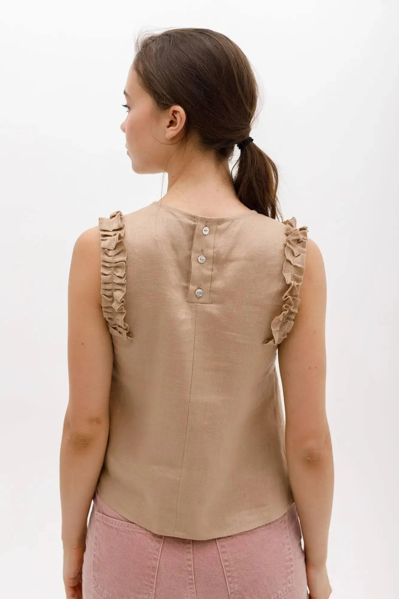 La Musculosa Solara combina sencillez y delicadeza en un diseño atemporal. Con volados sutiles a lo largo de los hombros, aporta un toque femenino sin perder su aire relajado. Ideal para los días cálidos, su corte recto y su caída liviana la convierten en una prenda versátil para cualquier ocasión.