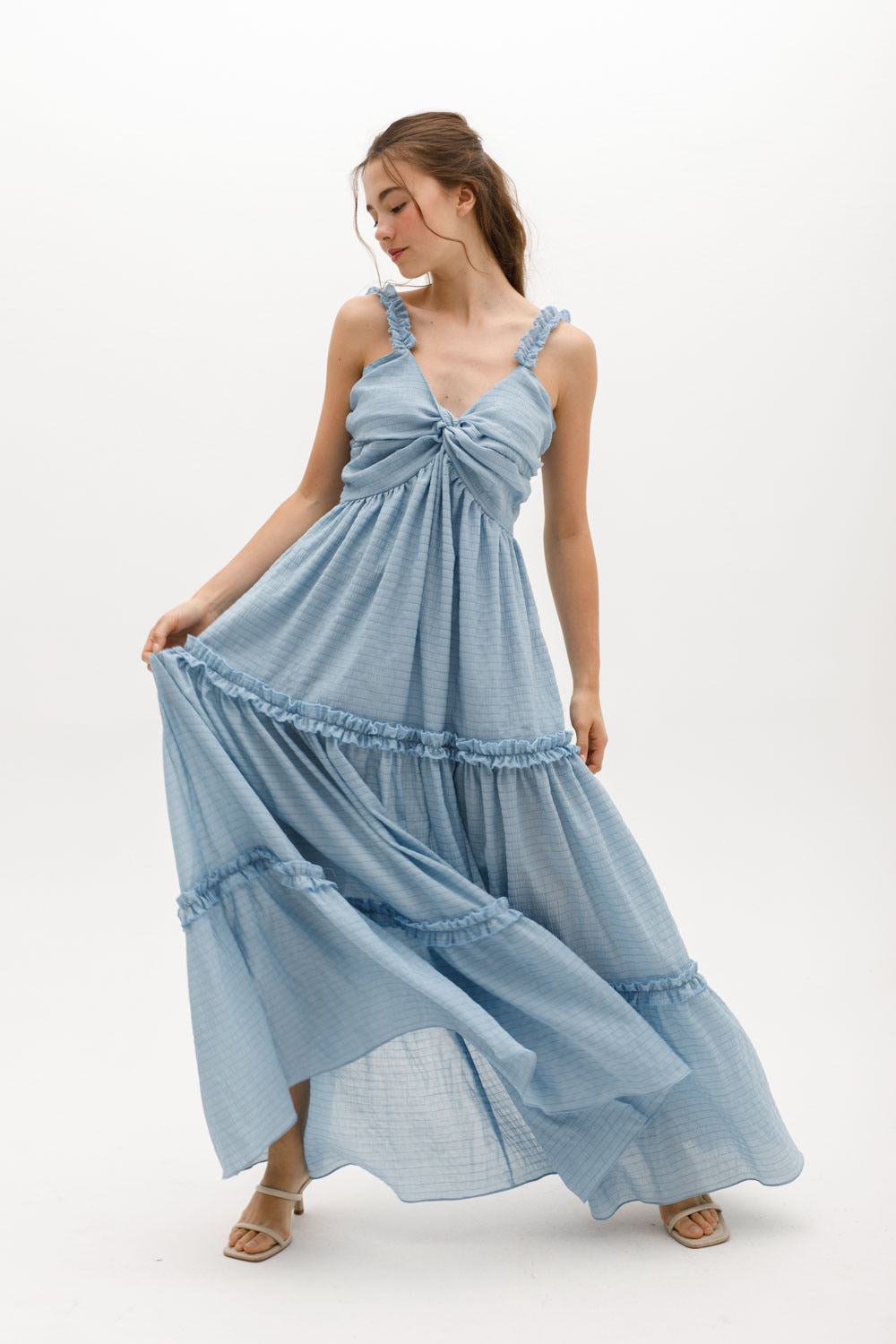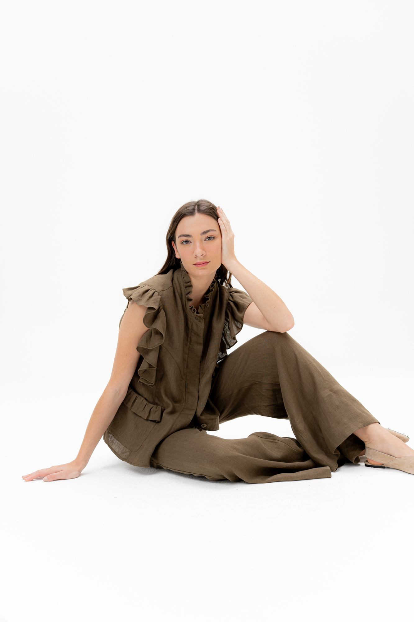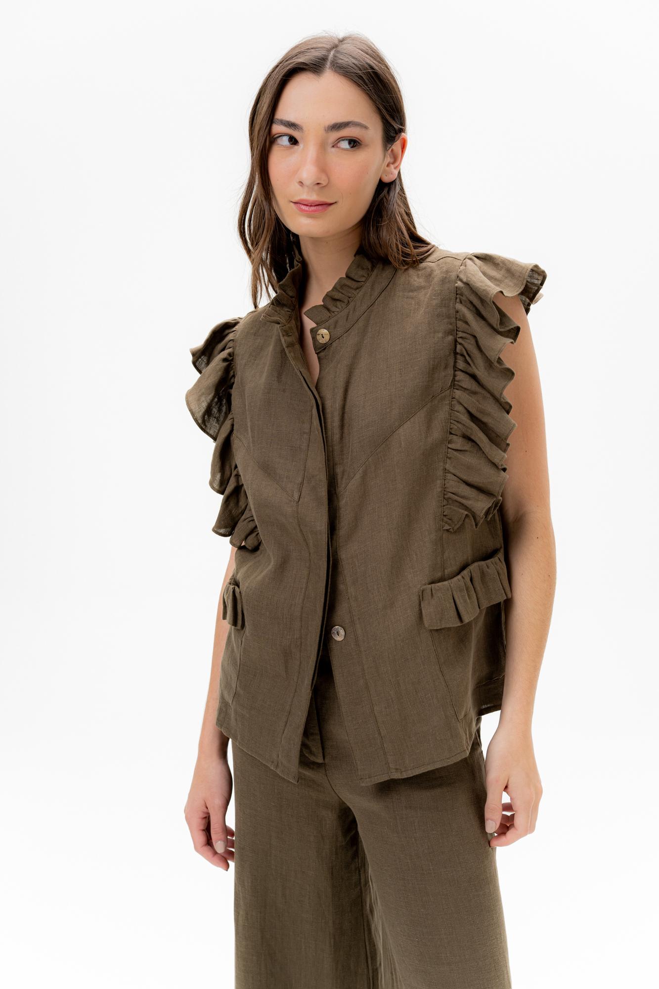 La Musculosa Solara combina sencillez y delicadeza en un diseño atemporal. Con volados sutiles a lo largo de los hombros, aporta un toque femenino sin perder su aire relajado. Ideal para los días cálidos, su corte recto y su caída liviana la convierten en una prenda versátil para cualquier ocasión.