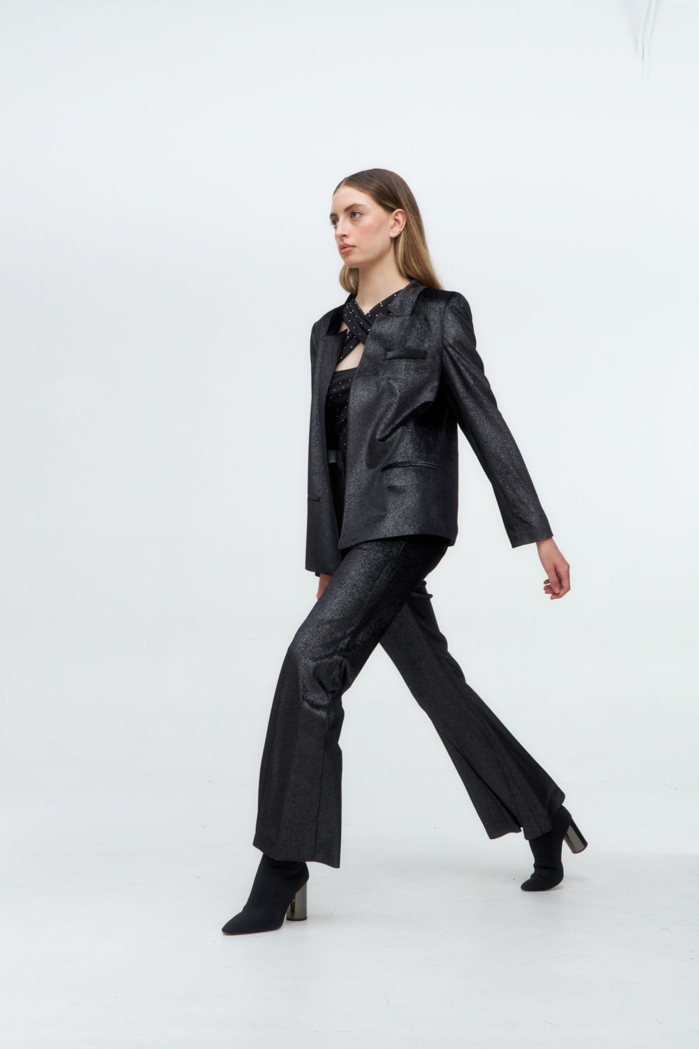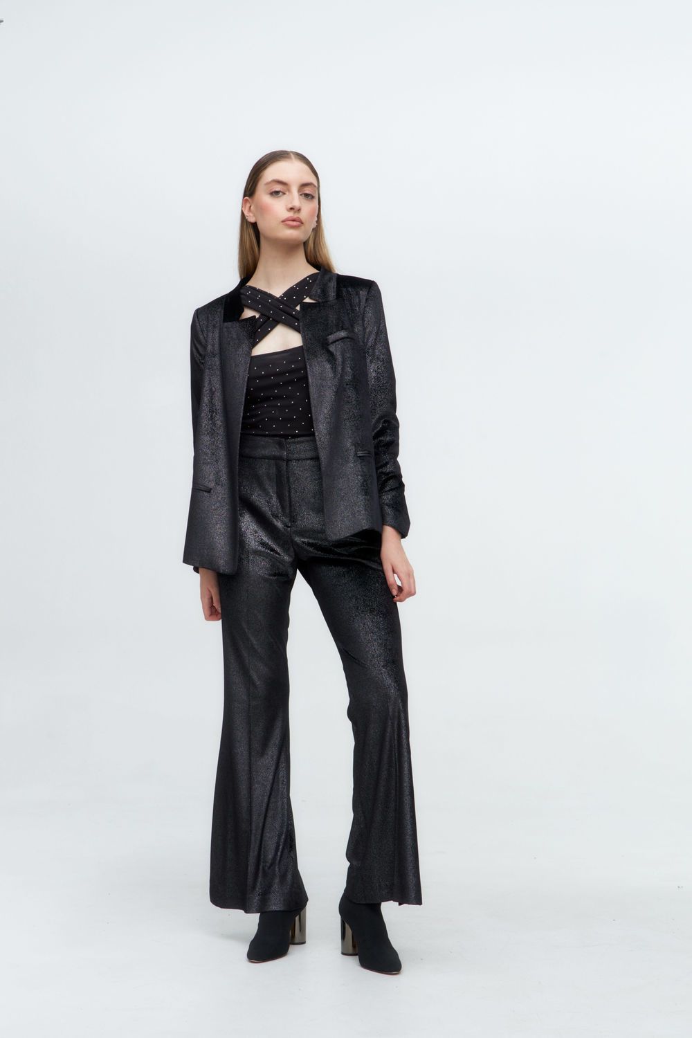 El pantal贸n Soleil es una pieza deslumbrante, confeccionada en una tela de terciopelo con lurex. Su acabado brillante y llamativo lo convierte en una opci贸n elegante y sofisticada para cualquier ocasi贸n. Este pantal贸n es el compa帽ero perfecto para el blazer Soleil, creando un conjunto coordinado que destaca por su estilo y glamour.