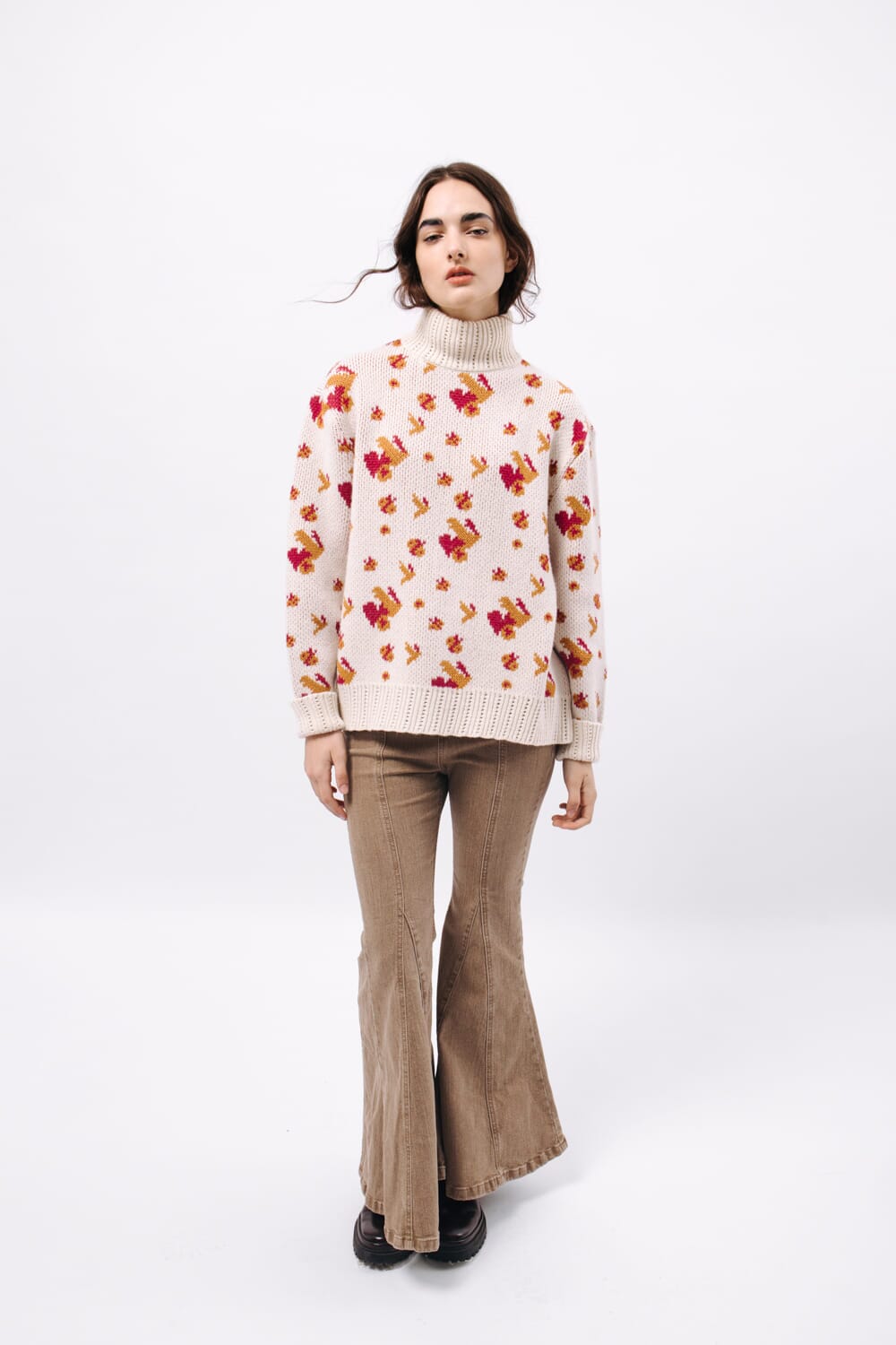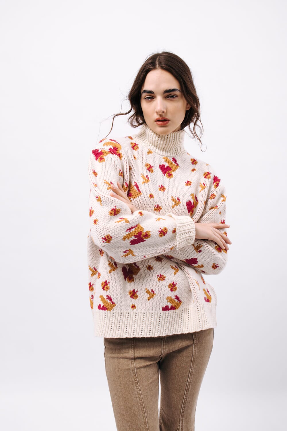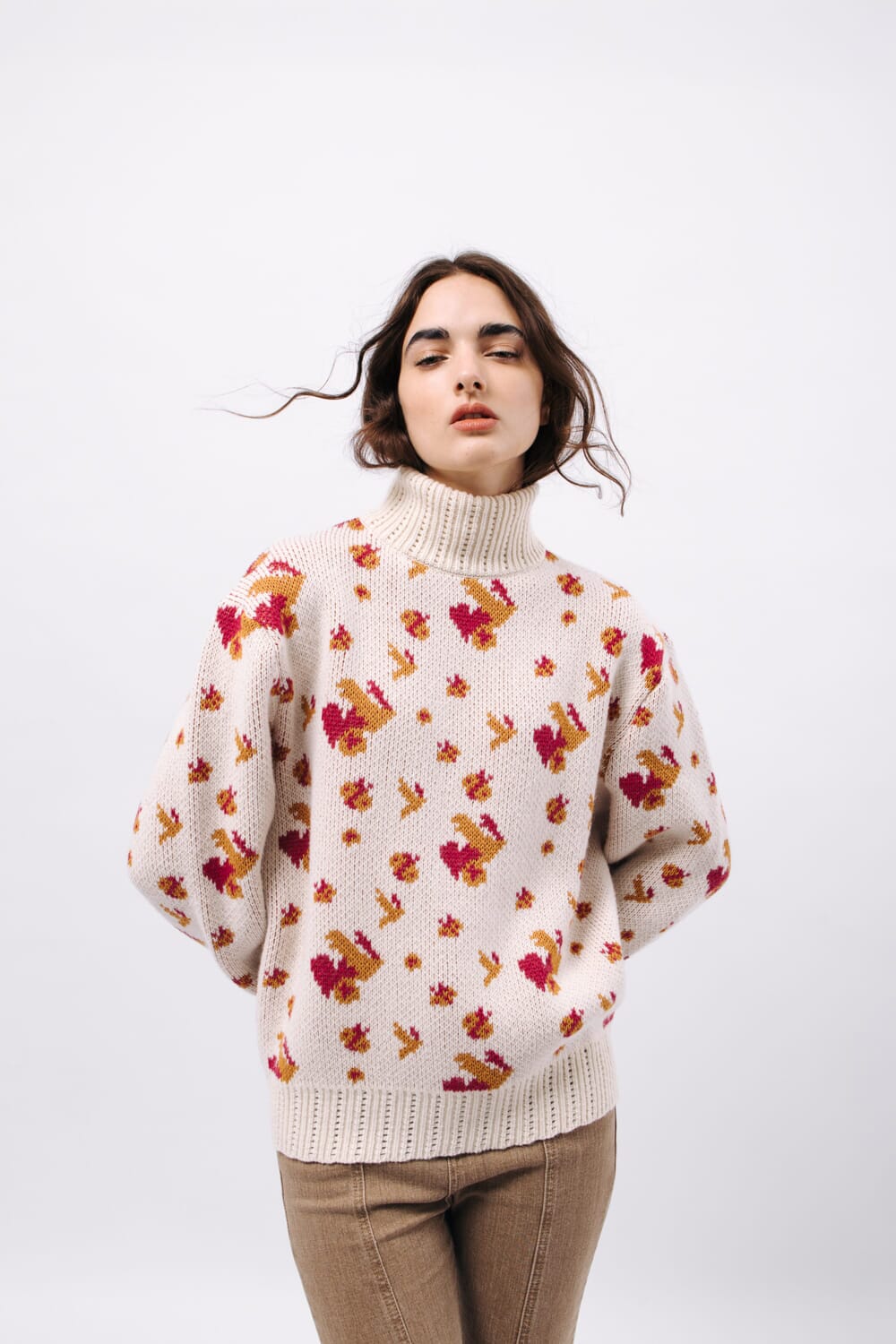 Buzo tejido con cuello alto y un diseño que combina los iconos de Margo. De fit holgado y abrigado, ideal para darle un toque de color y alegría a los días fríos.