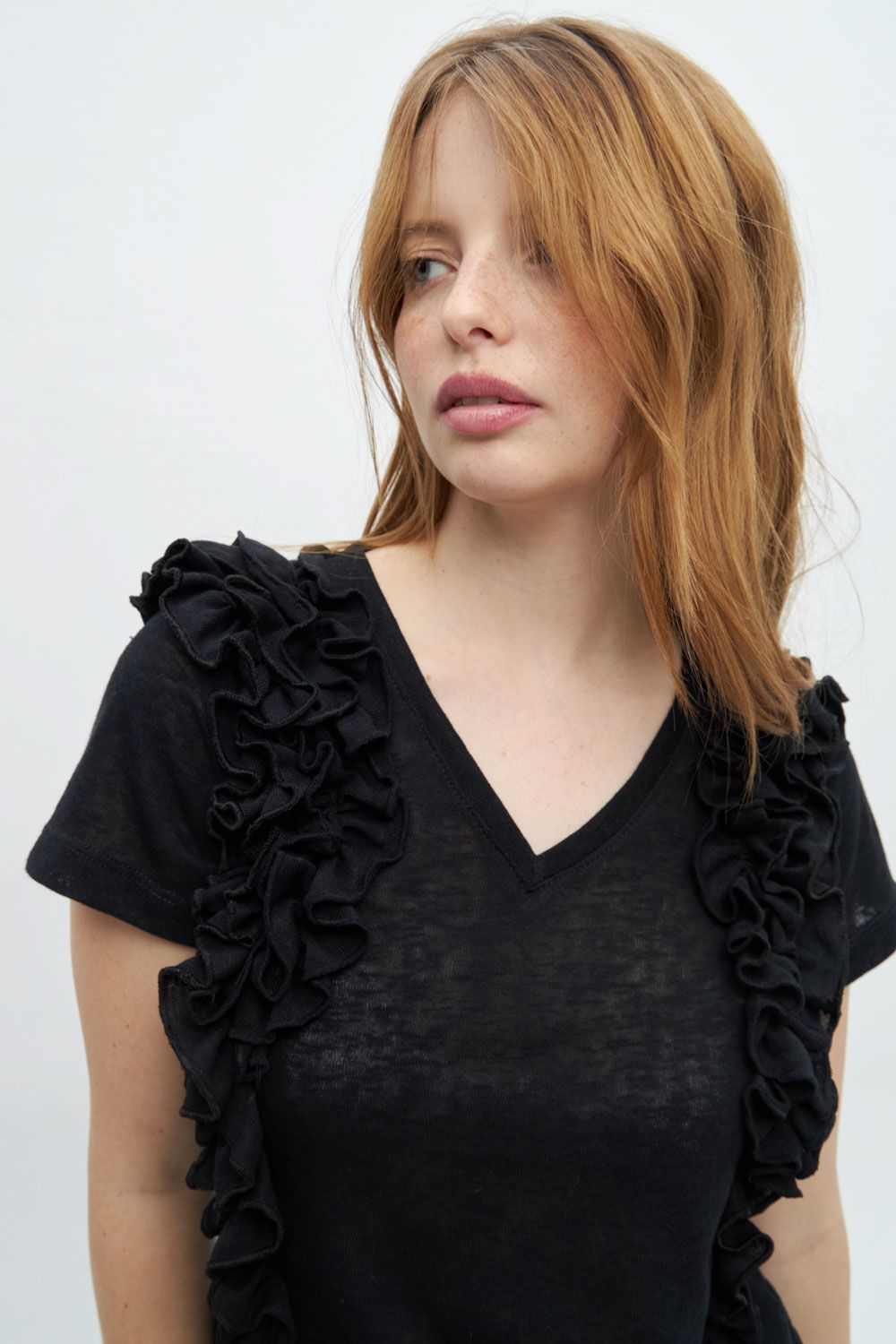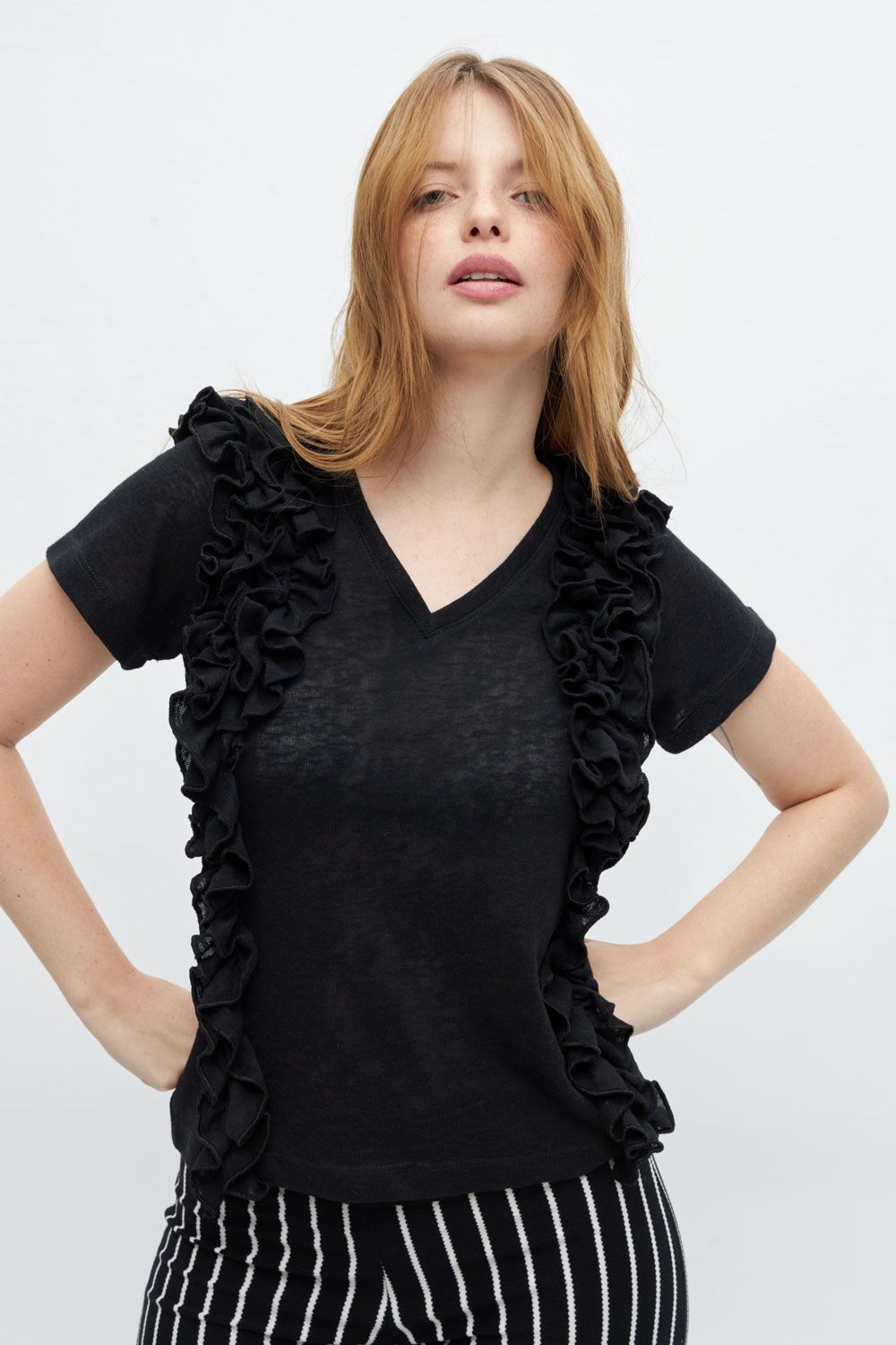 Eleva tus looks esta primavera/verano con nuestra remera Amyra, que presenta un escote en V. Sus volantes laterales añaden un toque de elegancia y personalidad, transformando una pieza clásica en algo especial.