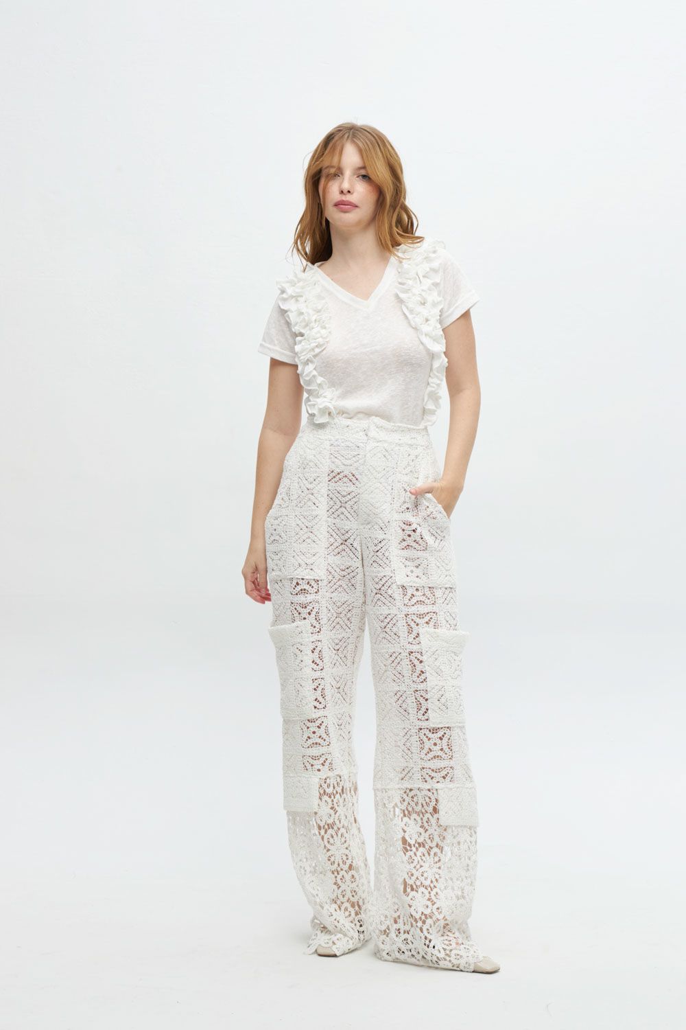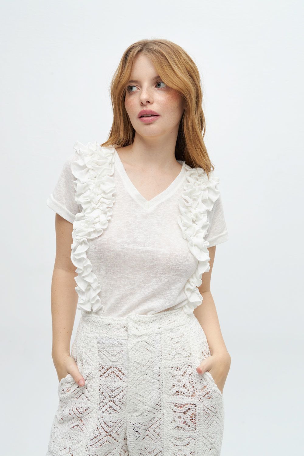 Eleva tus looks esta primavera/verano con nuestra remera Amyra, que presenta un escote en V. Sus volantes laterales añaden un toque de elegancia y personalidad, transformando una pieza clásica en algo especial.