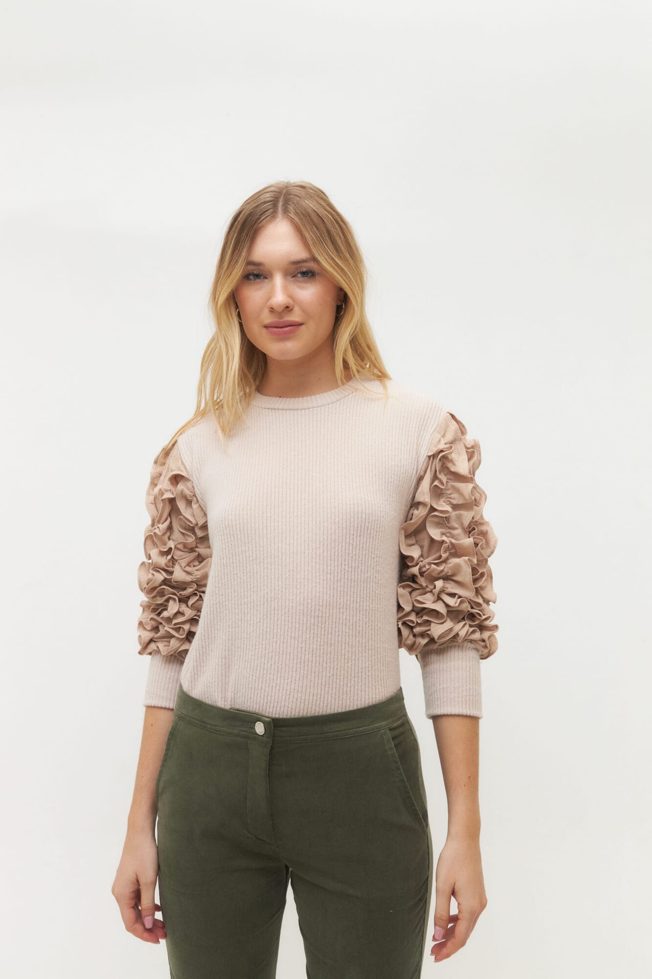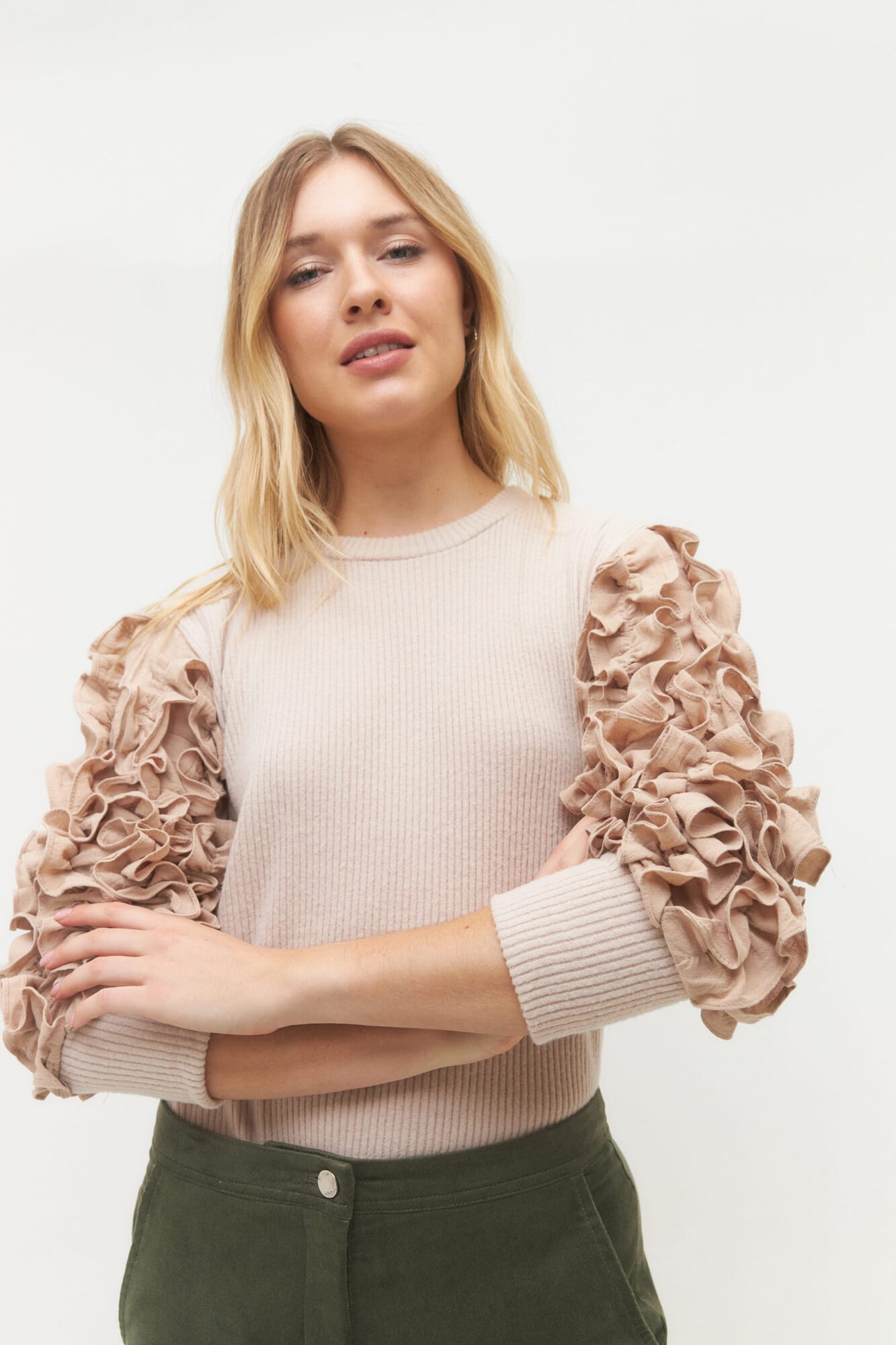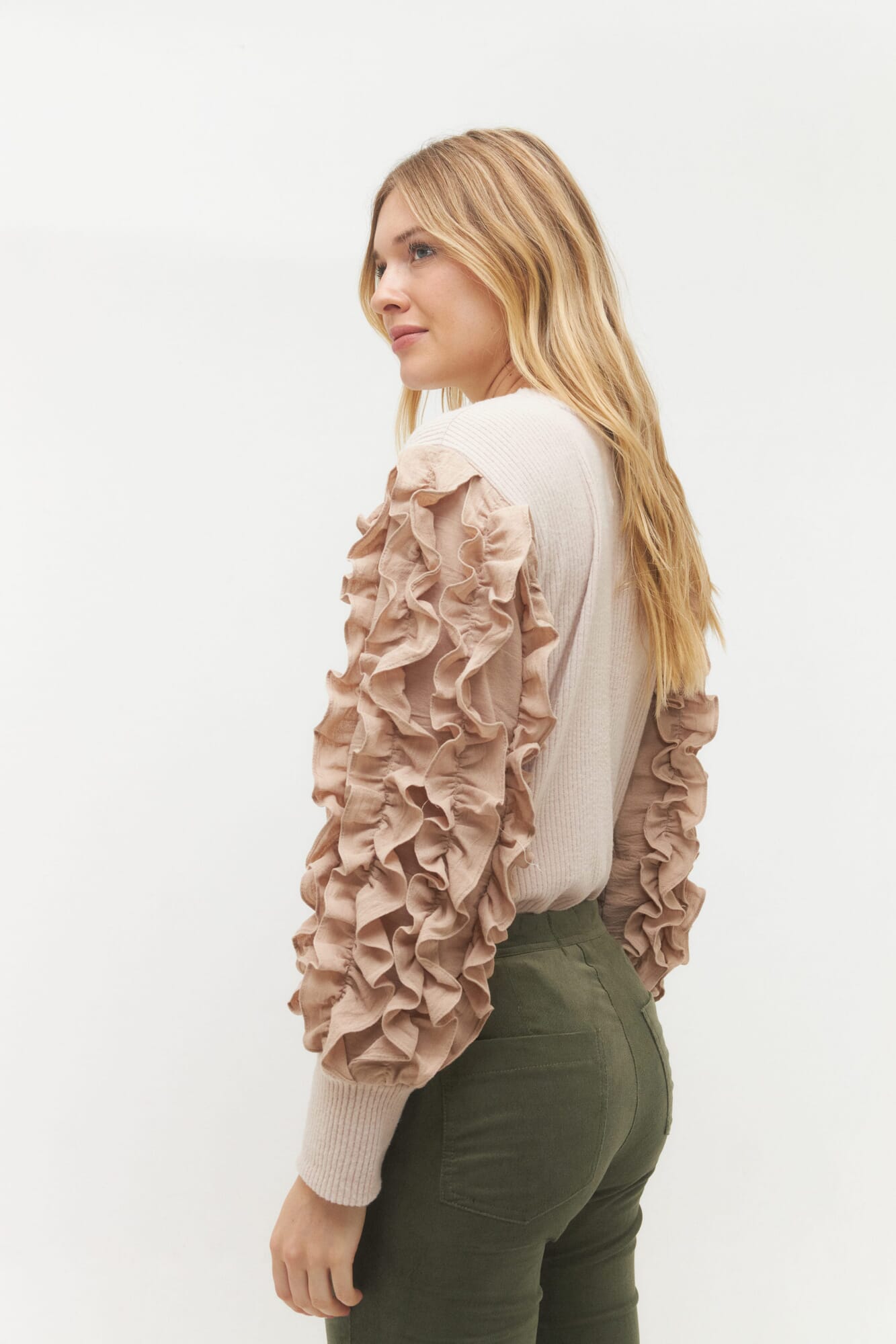 Esta remera es única por sus increíbles volados en ambas mangas. Ideal para darle onda a cualquier look.