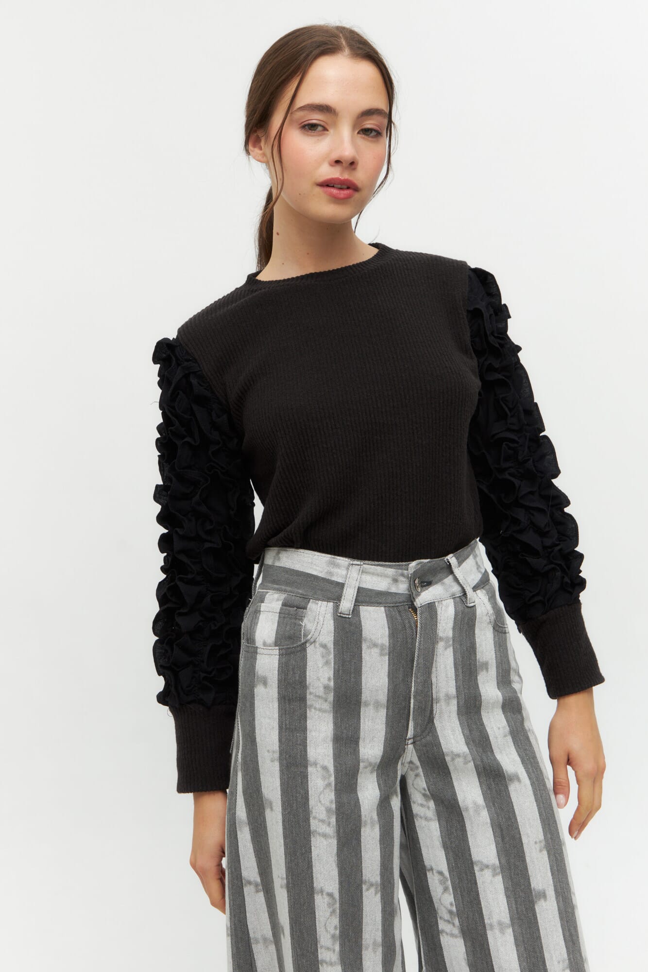 Esta remera es única por sus increíbles volados en ambas mangas. Ideal para darle onda a cualquier look.