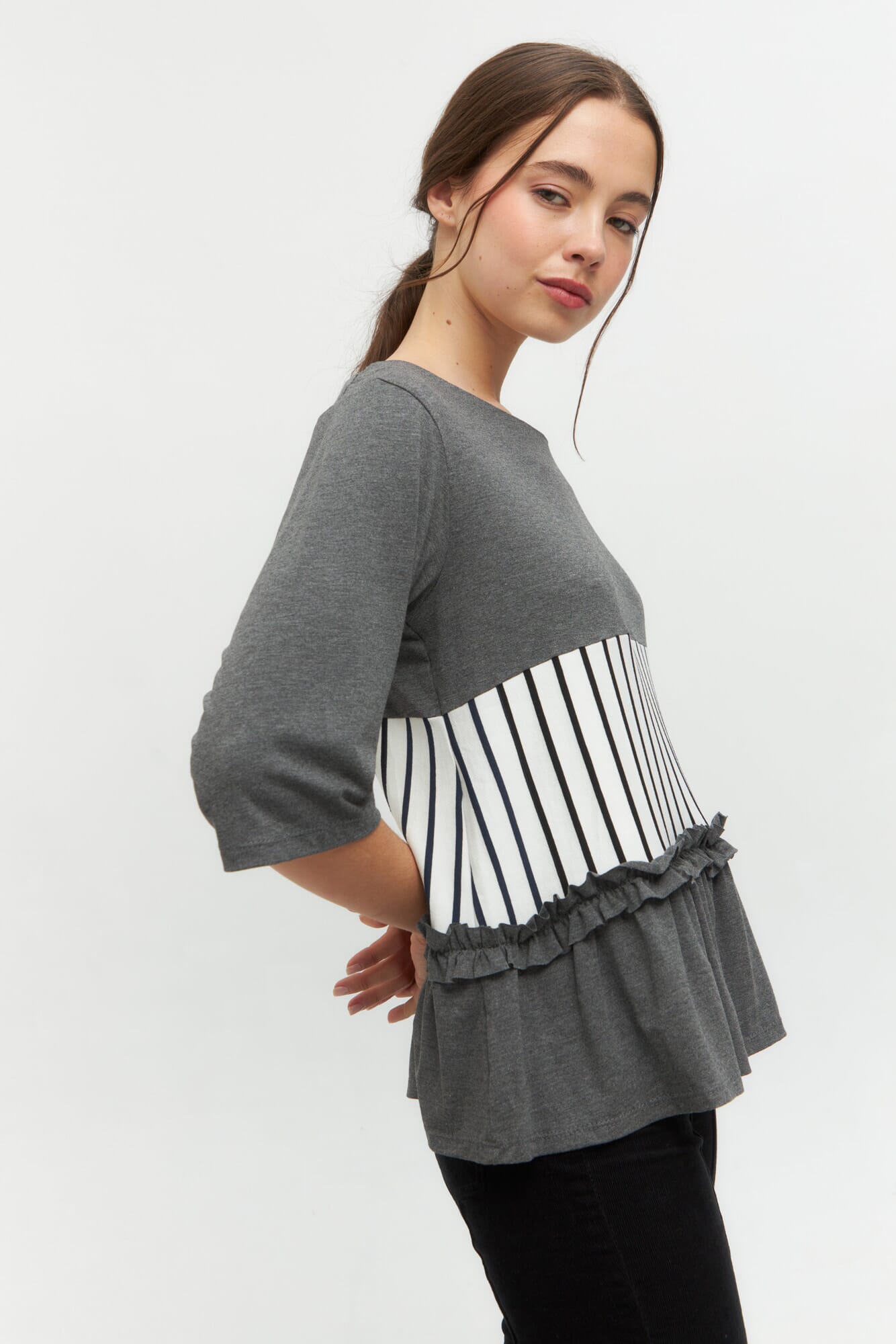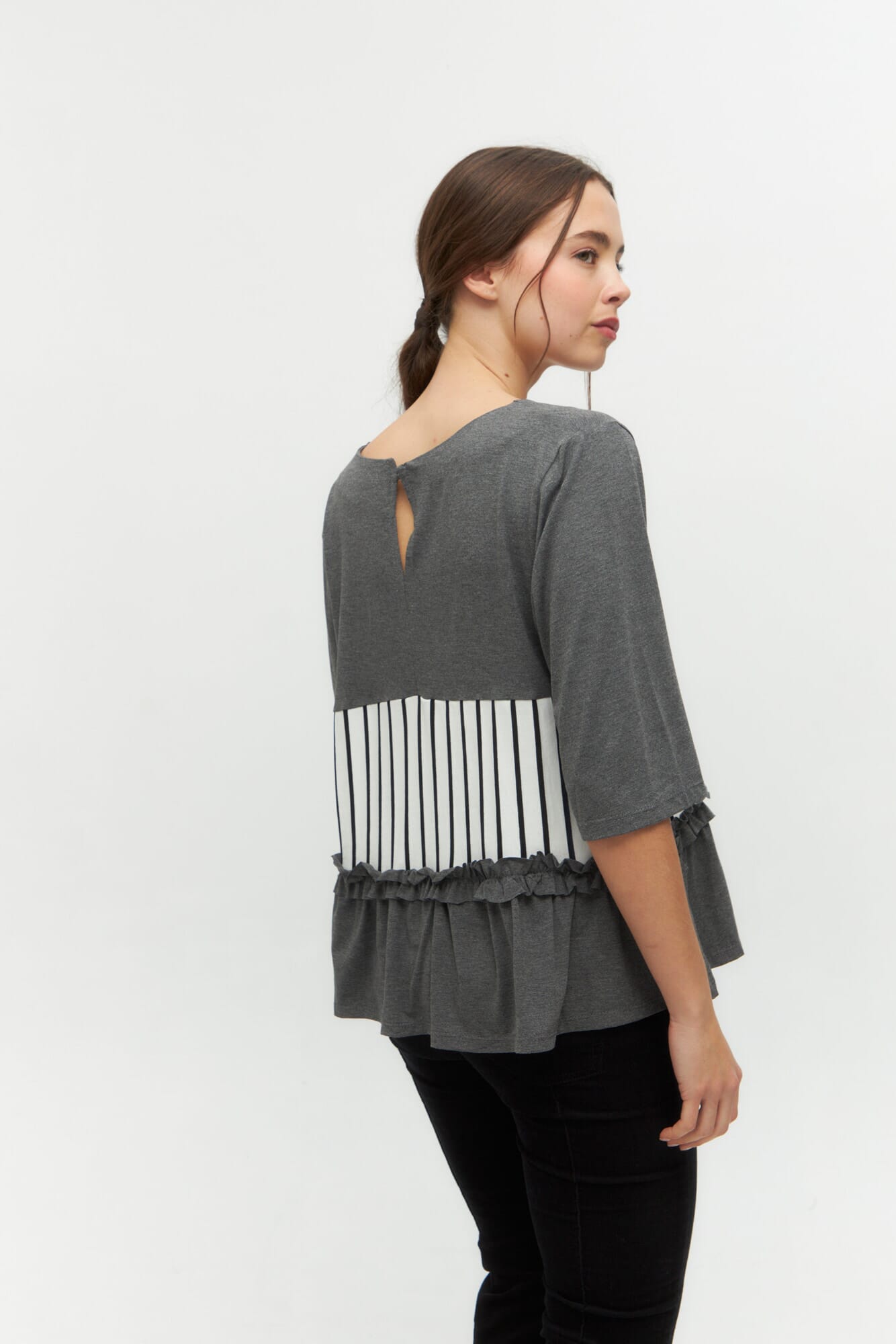 La Remera Ellis es un básico para incorporar a tu armario. El detalle de las rayas verticlaes estilizan un montón, y el volado le da la característica Margo.