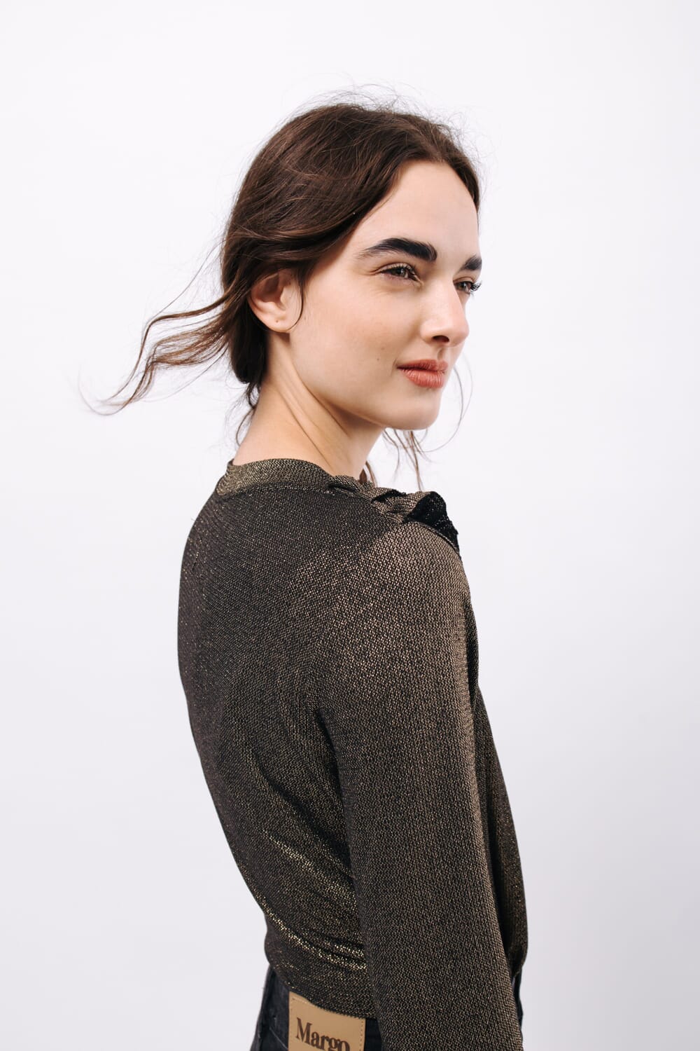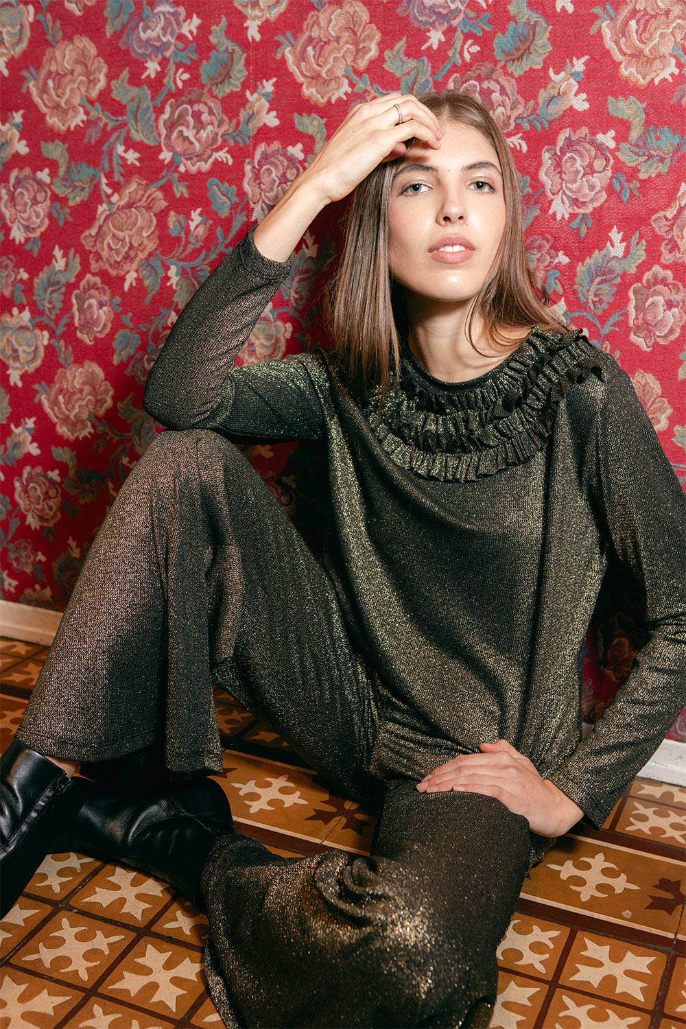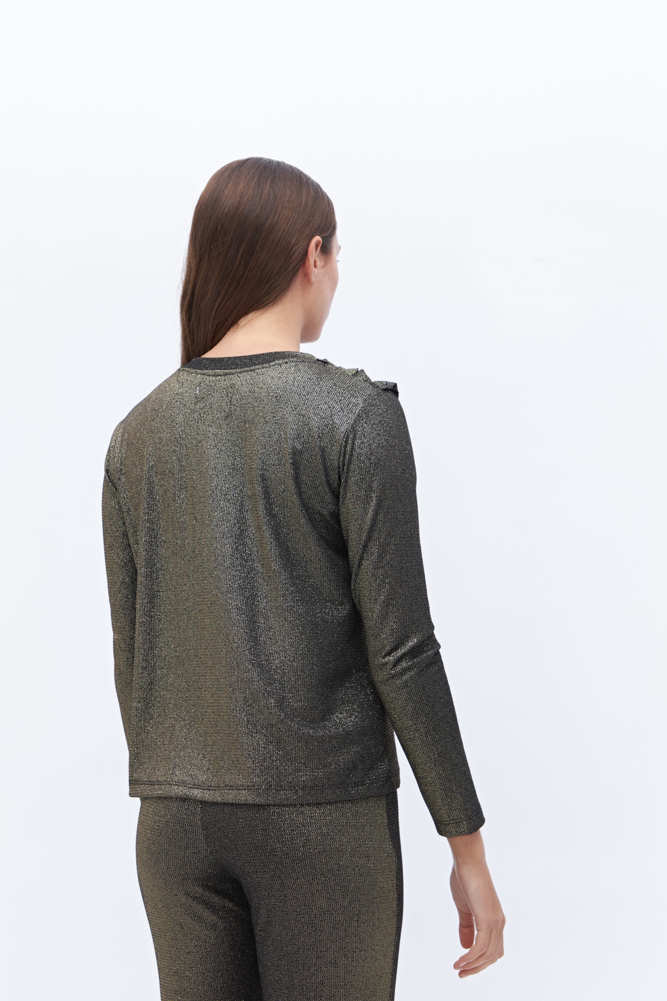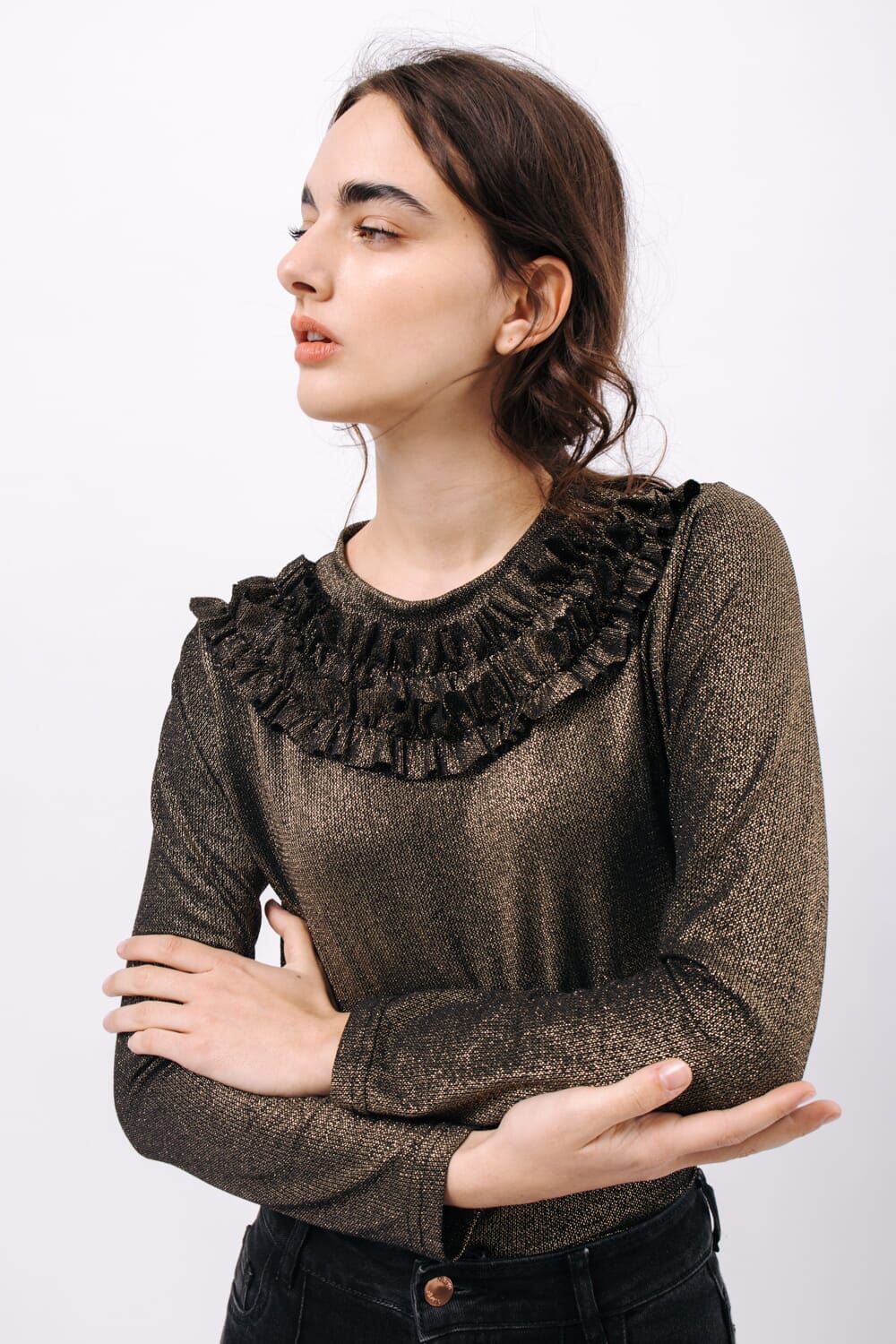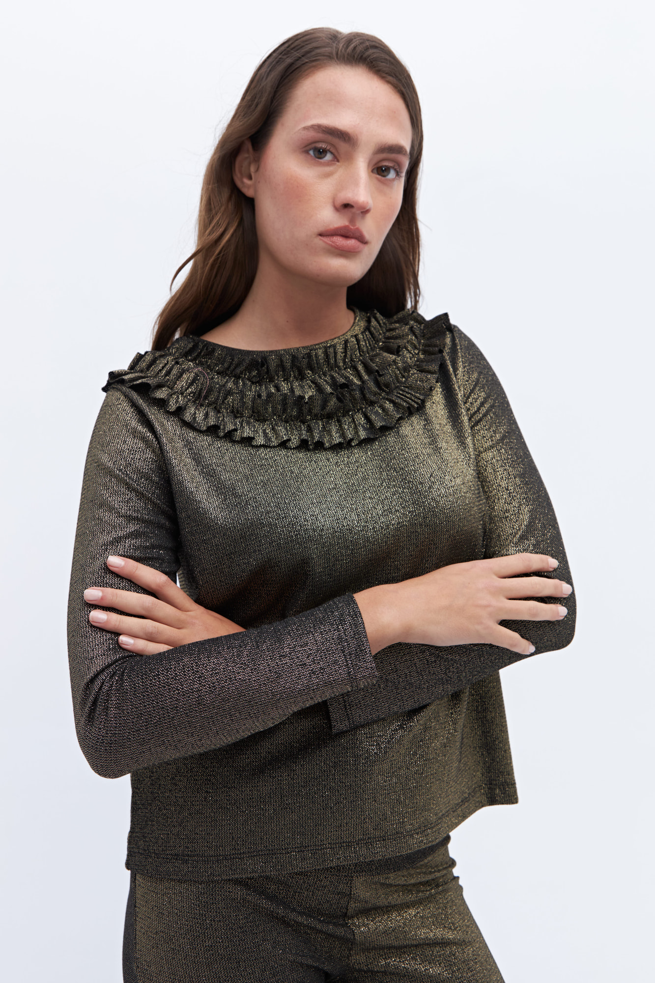 Remera de manga larga confeccionada en tejido de lurex negro con destellos dorados. Detalle de volados en el cuello tipo collar que aporta un toque elegante y sofisticado. Perfecta para elevar cualquier look.