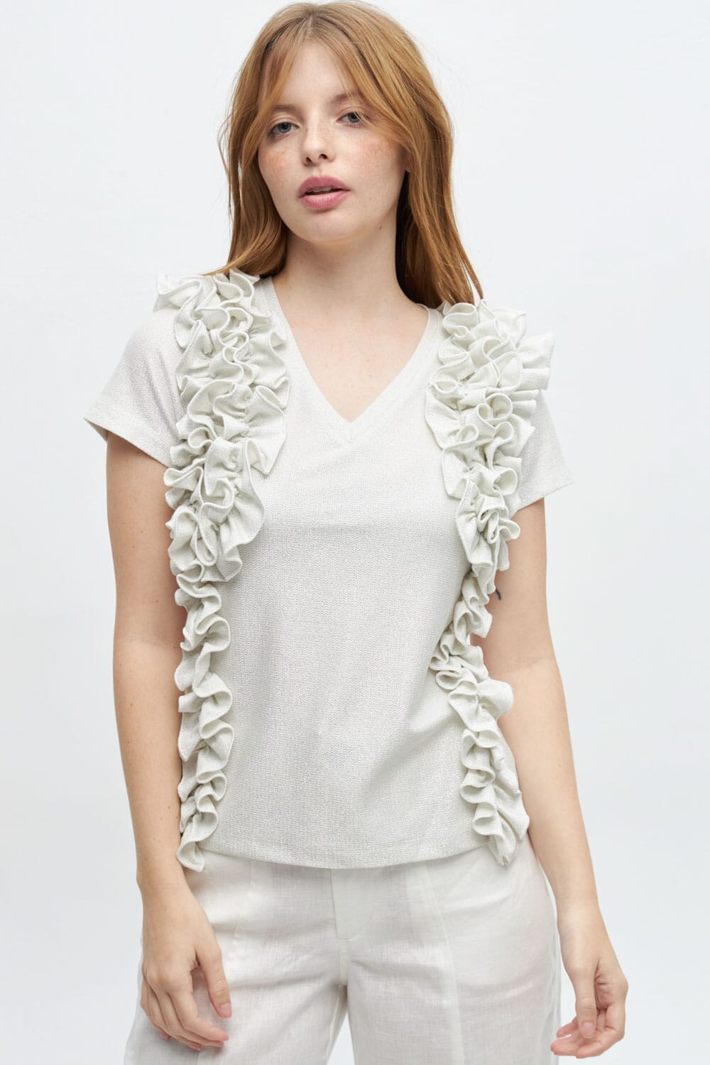 Elevá tus looks de primavera/verano con nuestra remera Myra, que presenta un escote en V. Sus volados laterales añaden un toque de elegancia y personalidad, transformando una pieza clásica en algo especial. La tela tejida tiene un brillo que lo hace muy llamativo.
