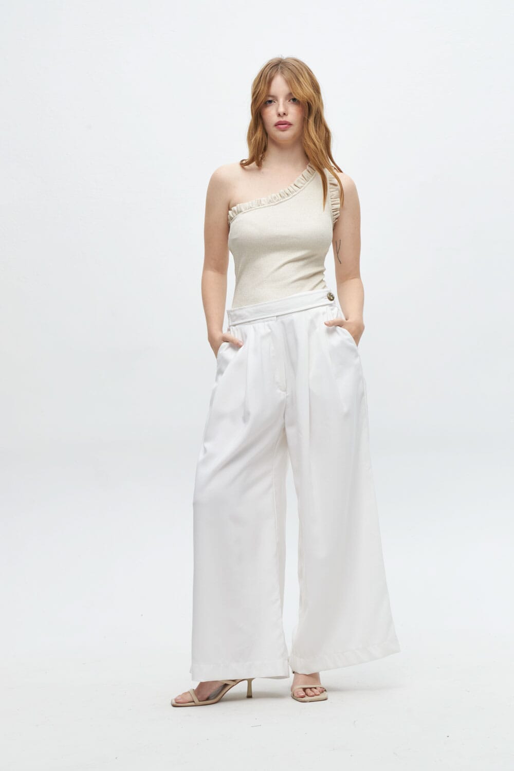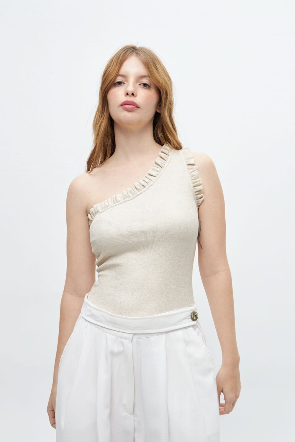 Este elegante top de tejido de punto destaca por su diseño asimétrico de un solo hombro, que aporta un toque moderno y chic. Los delicados volados en el escote y la sisa añaden un aire romántico y femenino, creando un efecto visual atractivo.Tiene un poco de lurex que genera un efecto visual muy sútil.