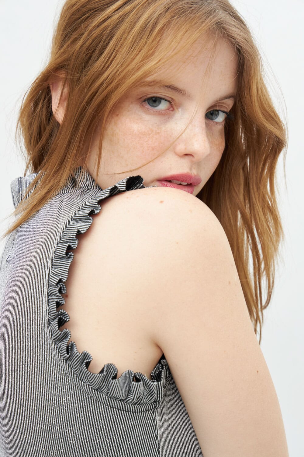 Este top de tejido de punto combina comodidad y estilo, con un sutil toque de brillo que le da un aire elegante. Sus volados en las sisas añaden un detalle femenino y moderno, haciendo de él una prenda versátil que puedes llevar tanto en ocasiones especiales como en tu día a día.