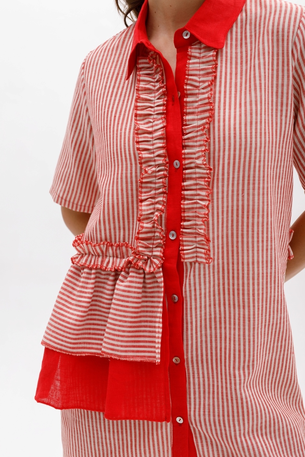 El Vestido Riba combina rayas suaves con detalles en lino 100% natural. Su cuello y cartera en tono lima claro iluminan la silueta, mientras los volados frontales y laterales aportan textura y movimiento.