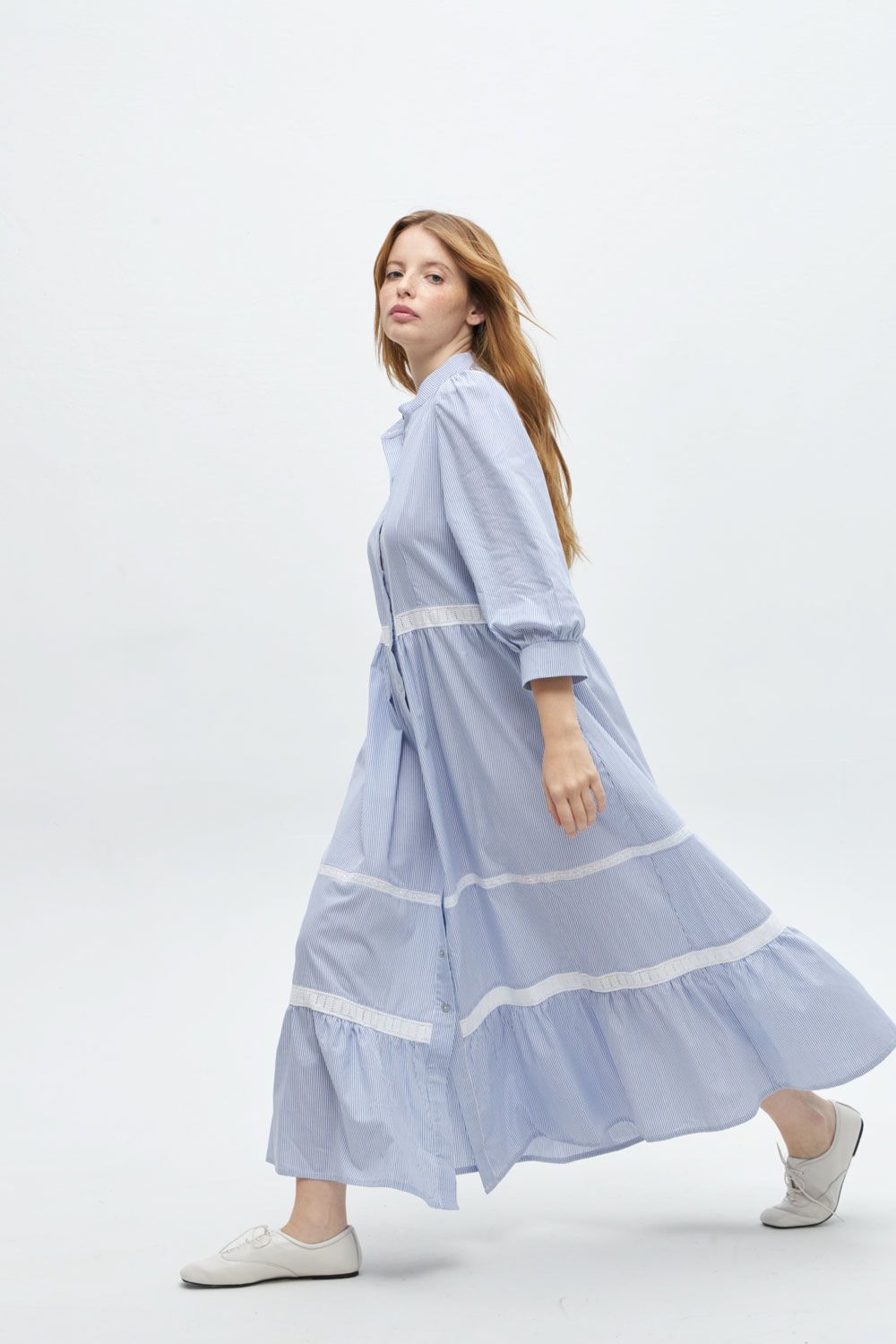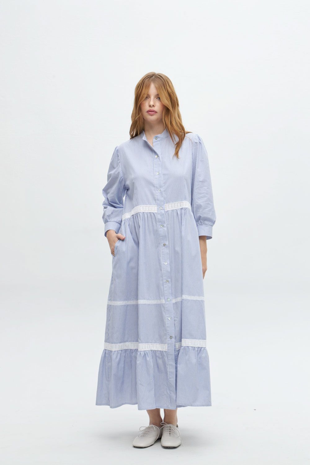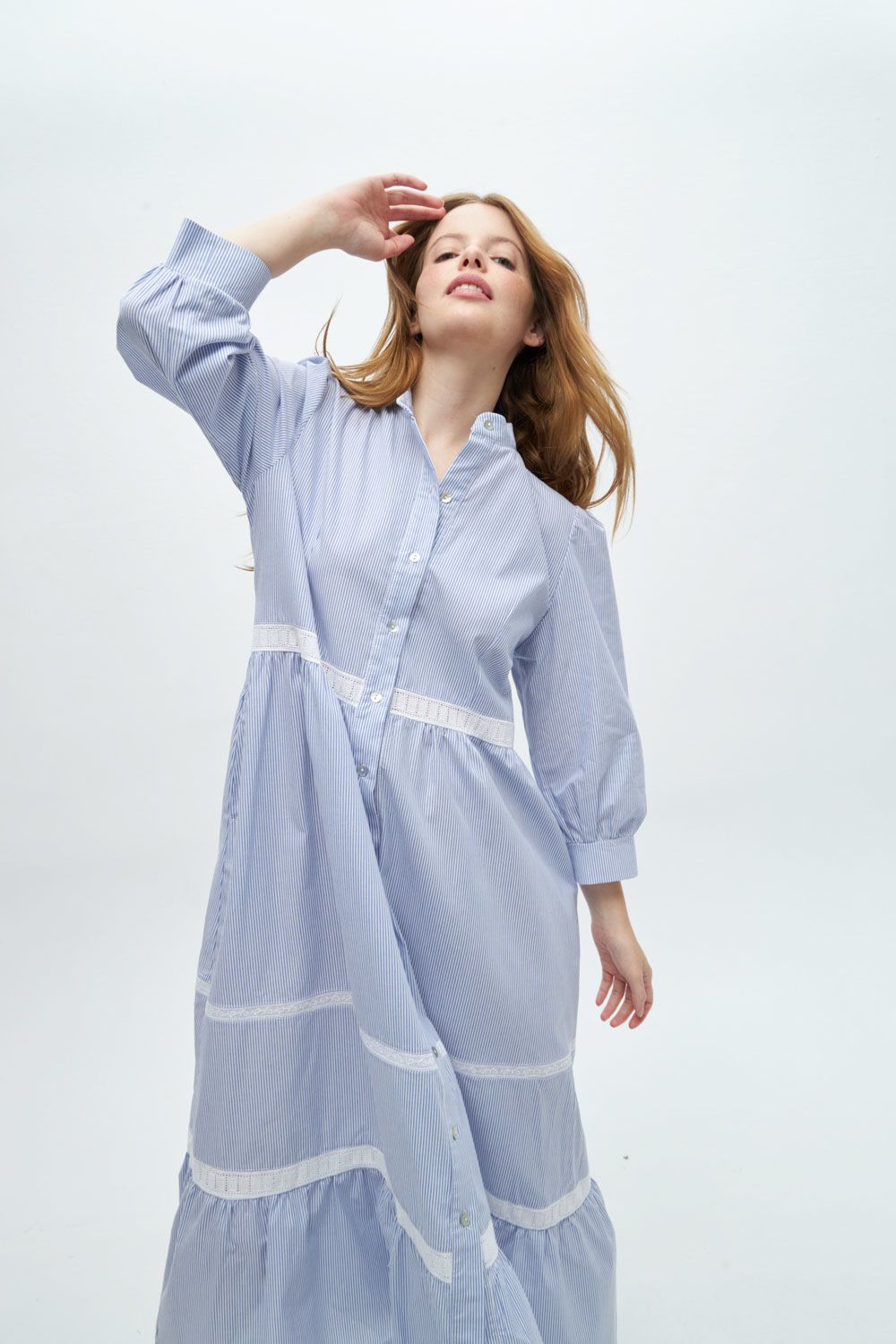 Este vestido camisero de manga 3/4 es la opci贸n perfecta para lucir c贸moda y fresca todos los d铆as. Festones de algodon en el cuerpo como detalle muy femenino. Su largo ideal lo convierte en una prenda vers谩til, perfecta para el trabajo y cualquier ocasi贸n casual.