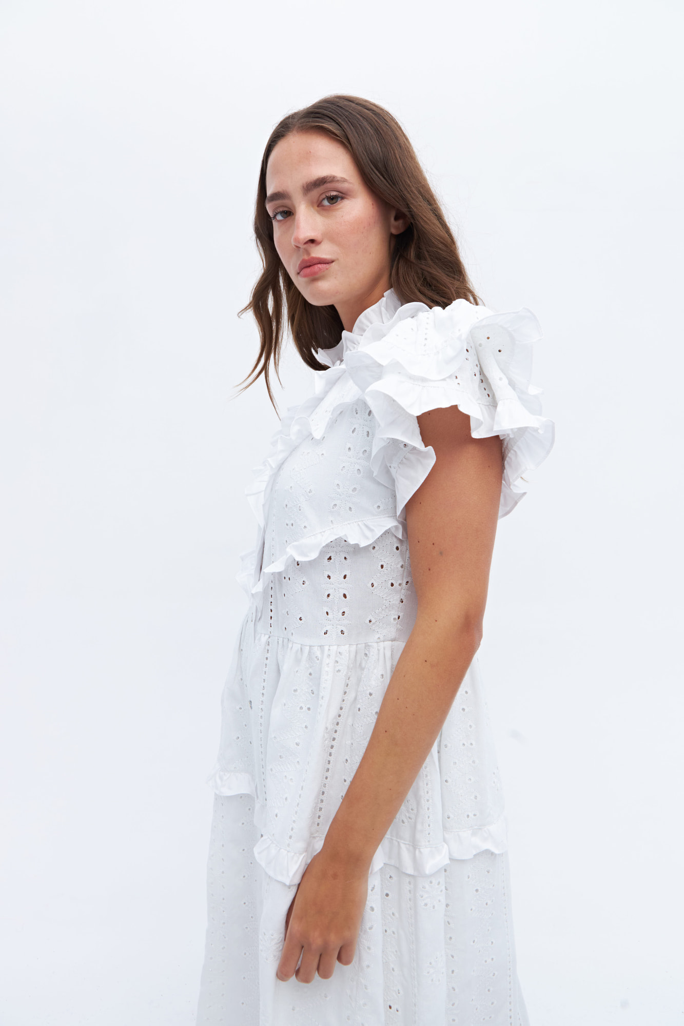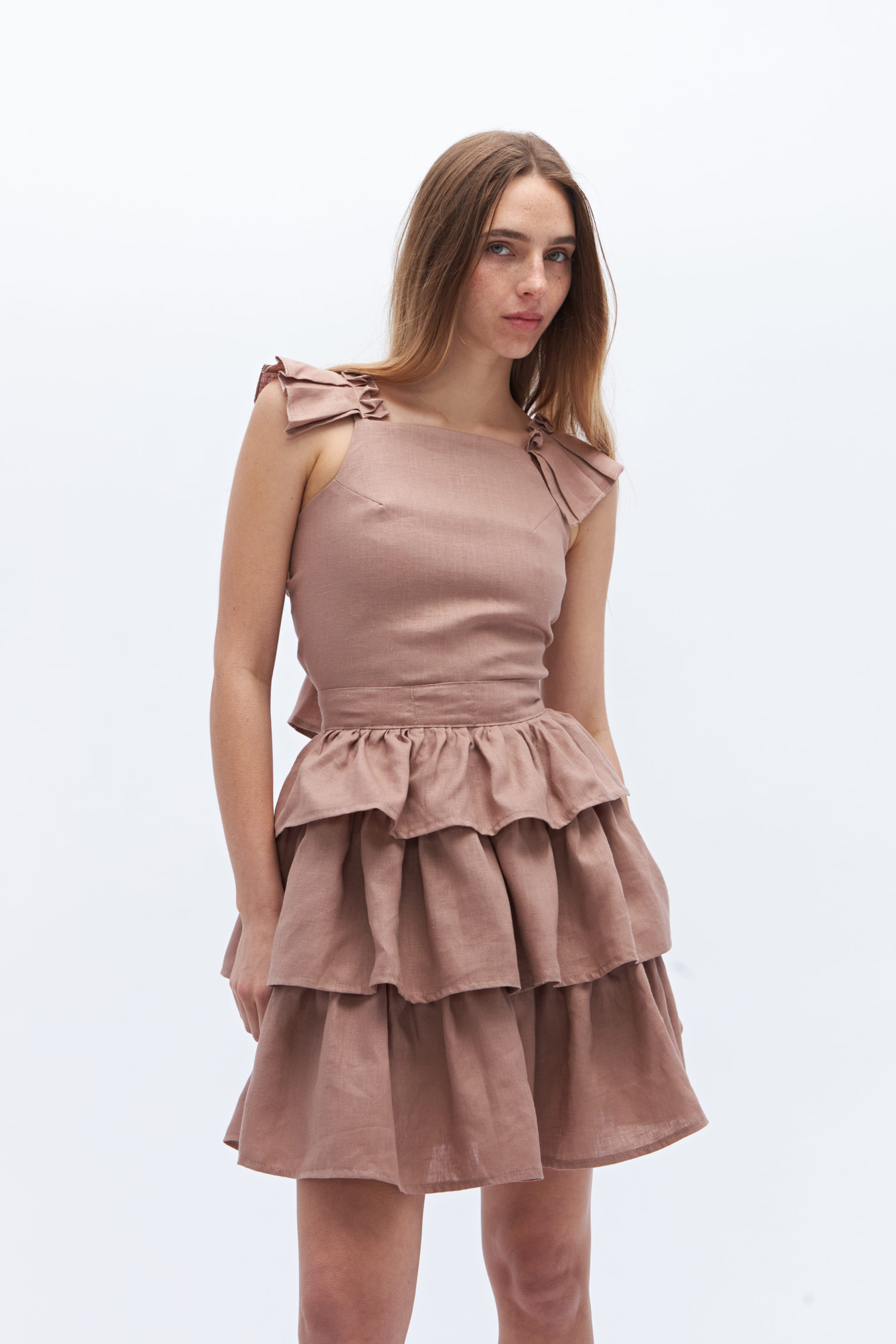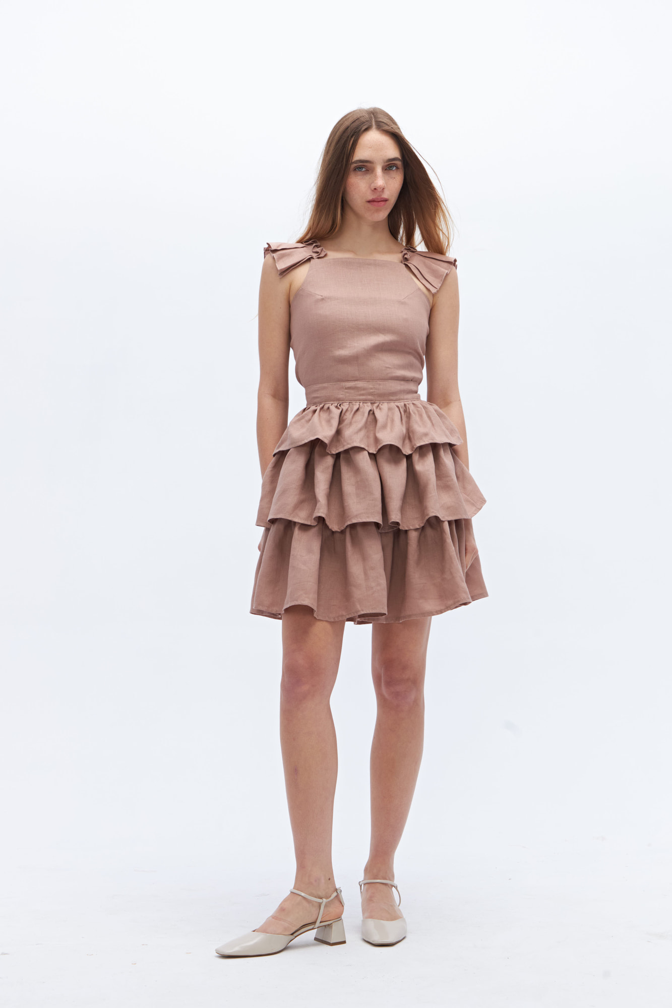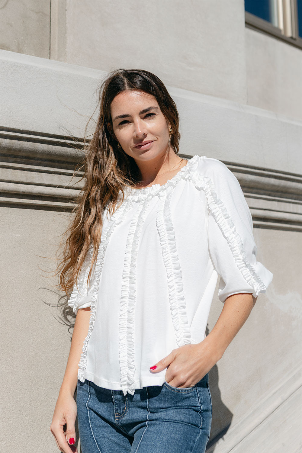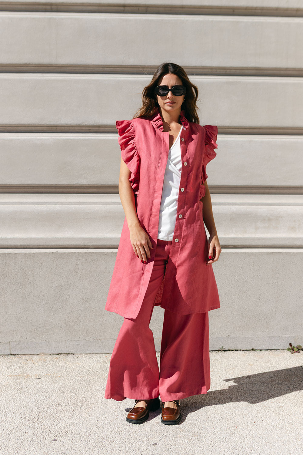 El Vestido Peonia se distingue por su silueta amplia y fluida, realzada con delicados volados en las mangas y líneas decorativas que acompañan la forma. Un diseño que une comodidad y estilo, pensado para destacar con un aire femenino y actual.